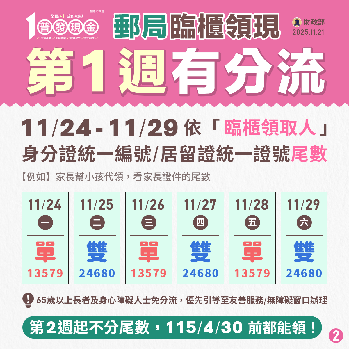 財政部表示,為提供民眾多元便利管道領取普發現金,自114年11月24日開放郵局領現,領取期間至115年4月30日止,民眾可於郵局營業時間至櫃檯領取,計有1,292間郵局據點,遍布全臺鄉鎮及離島地區,請民眾視方便時間就近領取,在前往郵局領現前,可先使用行動郵局APP查詢附近郵局的等候人數並線上取號,以減少現場排隊時間。