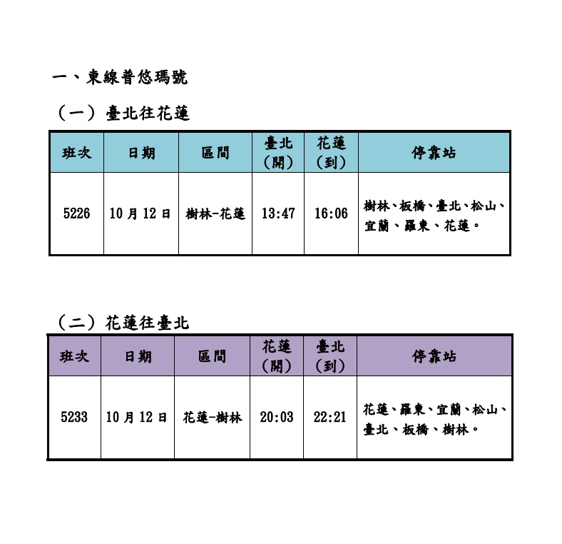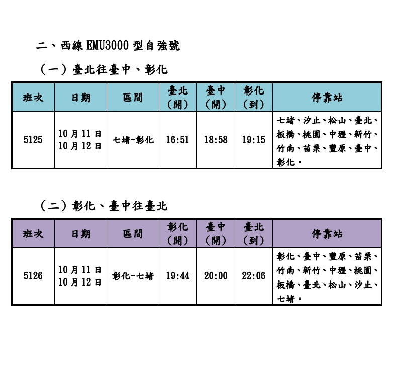 因應國慶連假期間返鄉(工)需求增加,為加強服務旅客,於114年10月11日至10月12日加開七堵=彰化EMU 3000型自強號4列次、10月12日加開樹林=花蓮普悠瑪號2列次,可再增加座位數共計2,896個,整體運能較平日增加6.1%。
