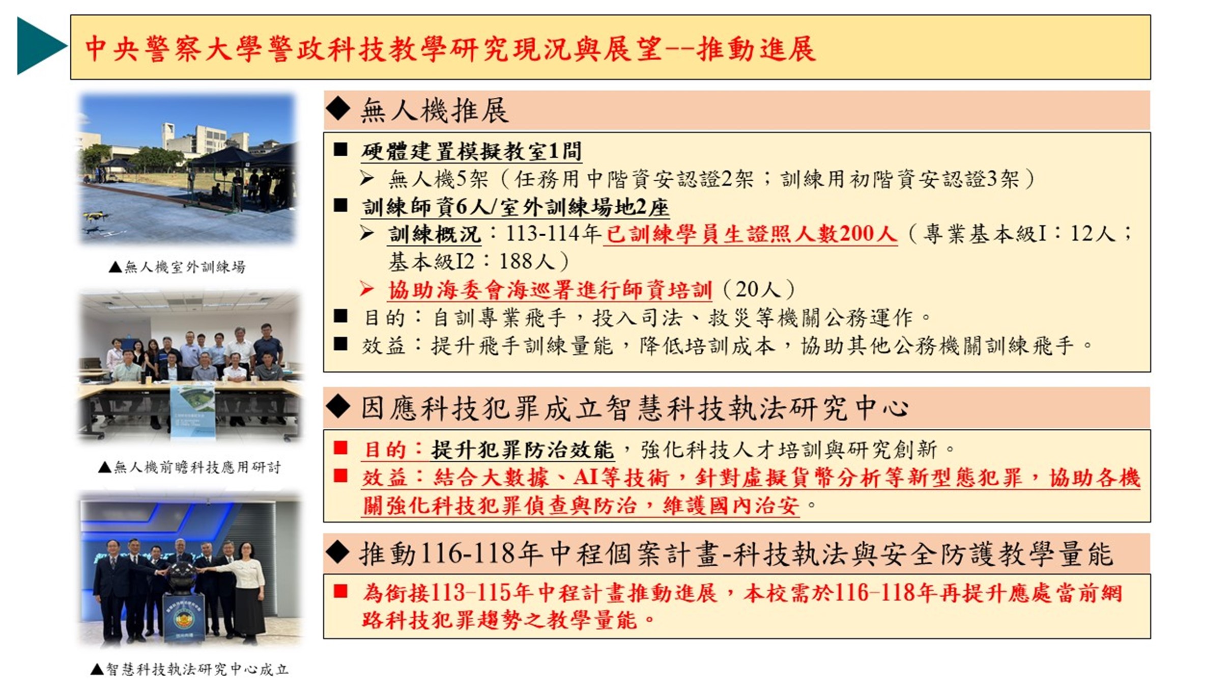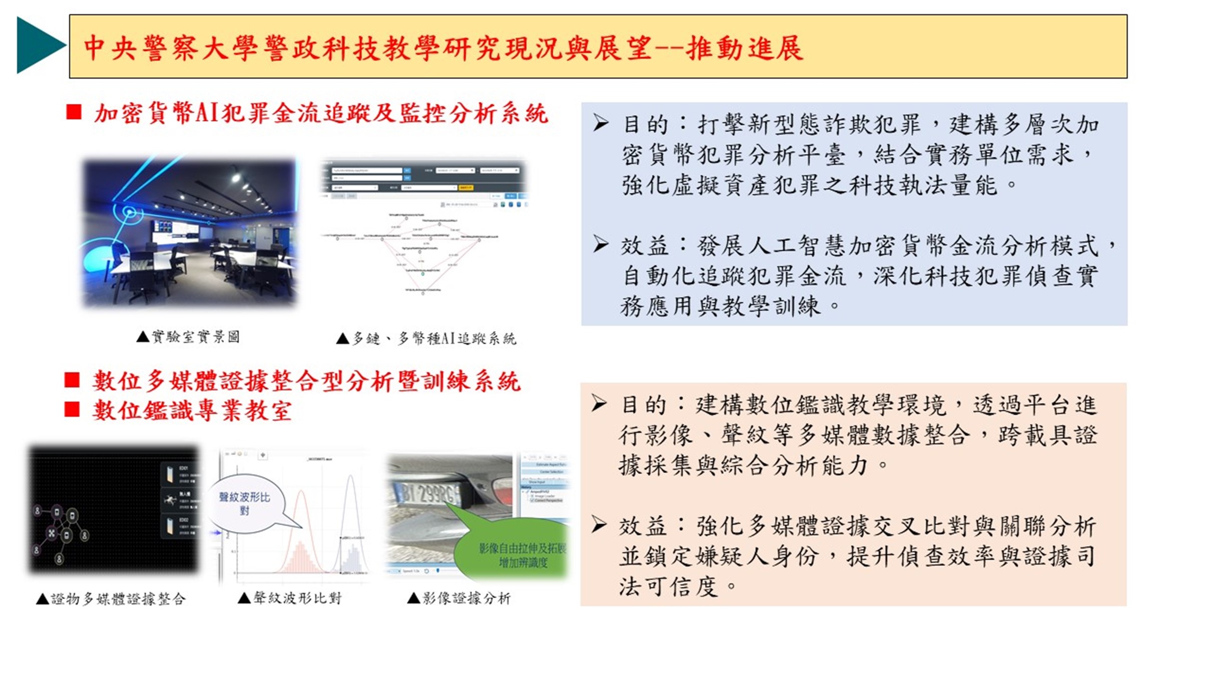 內政部指出,警察大學113至115年推動教學強化計畫,在導入人工智慧(AI)、無人機等先進技術,並建置加密貨幣追蹤、數位證據分析及大數據偵查系統,有效提升執法效率與偵查精準度。為延續成果並因應新型態治安挑戰,將持續精進智慧科技執法與安全防護教學量能提升,更加強化科技素養與應變能力之培育,以培養新世代警察所需專業能力。