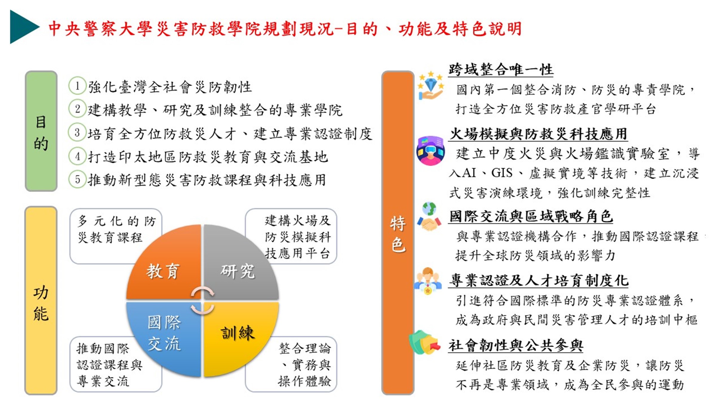 另災害防救學院預計於115年10月底完成設立,將整合高等教育、研究機構及實務訓練場域,打造成專業知識、技能與運用三合一的完整學習體系。未來內政部將持續推動「智慧科技」與「災害應變」雙軸發展,強化執法幹部在網路詐騙、跨境洗錢、假訊息等領域的偵查能力,同時深化防災教育與跨域整合,厚植治安與災防量能,全面守護民眾安全與國家韌性。