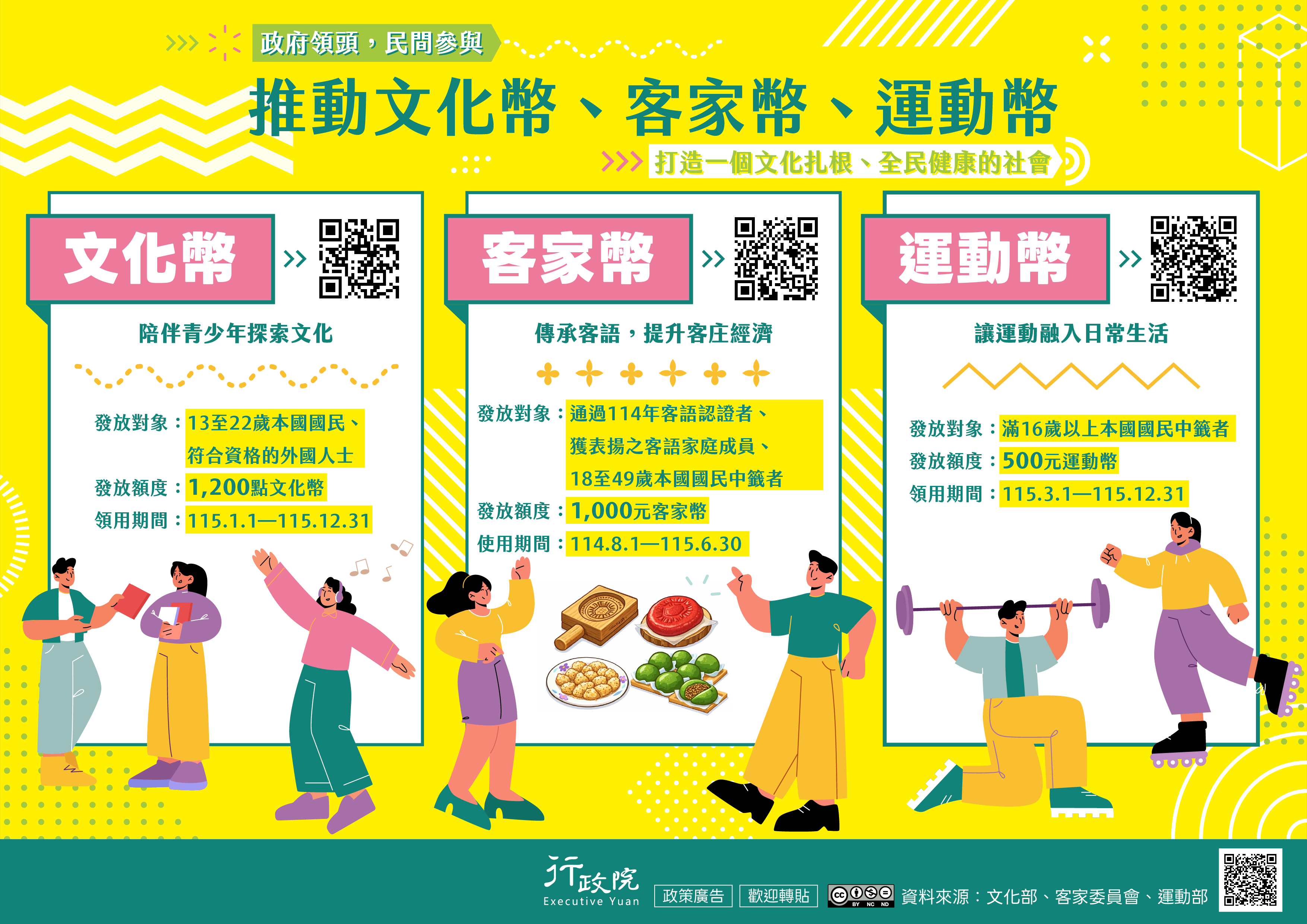 行政院長卓榮泰今(22)日於行政院會聽取文化部、客家委員會及運動部「文化幣、客家幣、運動幣之執行規劃及成效」報告後表示,為鼓勵青少年踴躍參與藝文、運動等休閒活動,並促進相關產業發展,文化部於112年開始發行文化幣,使臺灣成為亞洲第一個推動文化禮金政策的國家;客委會亦於去(114)年8月推動客家幣,而運動部將於今(115)年把「青春動滋券」轉型為「運動幣」,並擴大發放對象。