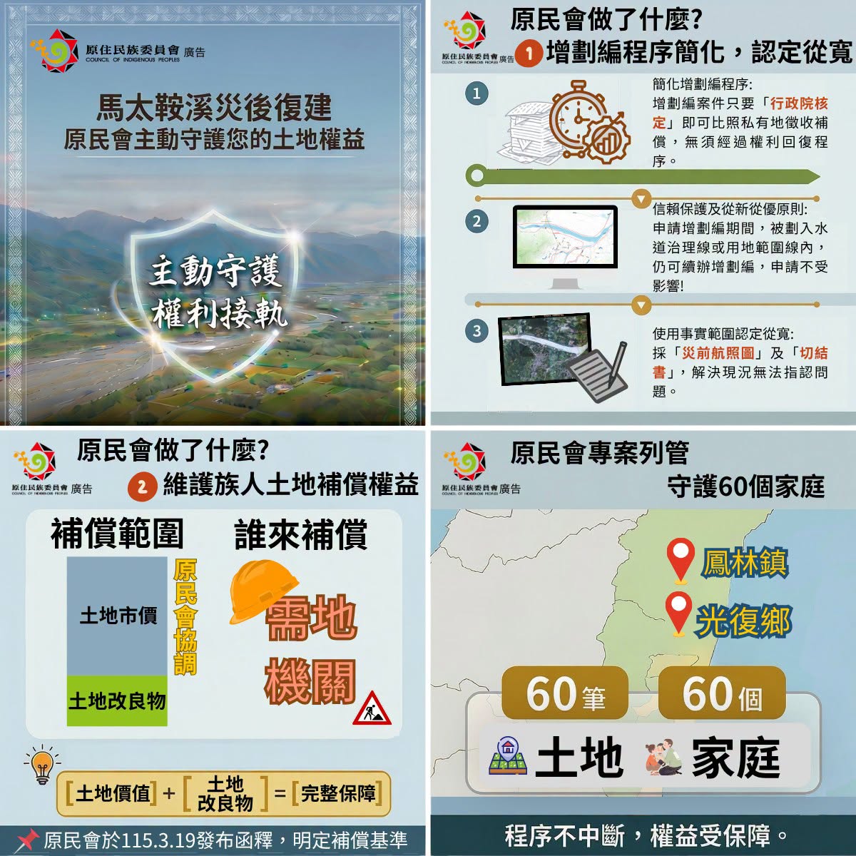 原民會為守護災區族人家園及原住民土地權利,主動協處研訂規範,讓流程更清楚、程序更簡化,以維護族人的土地權益。