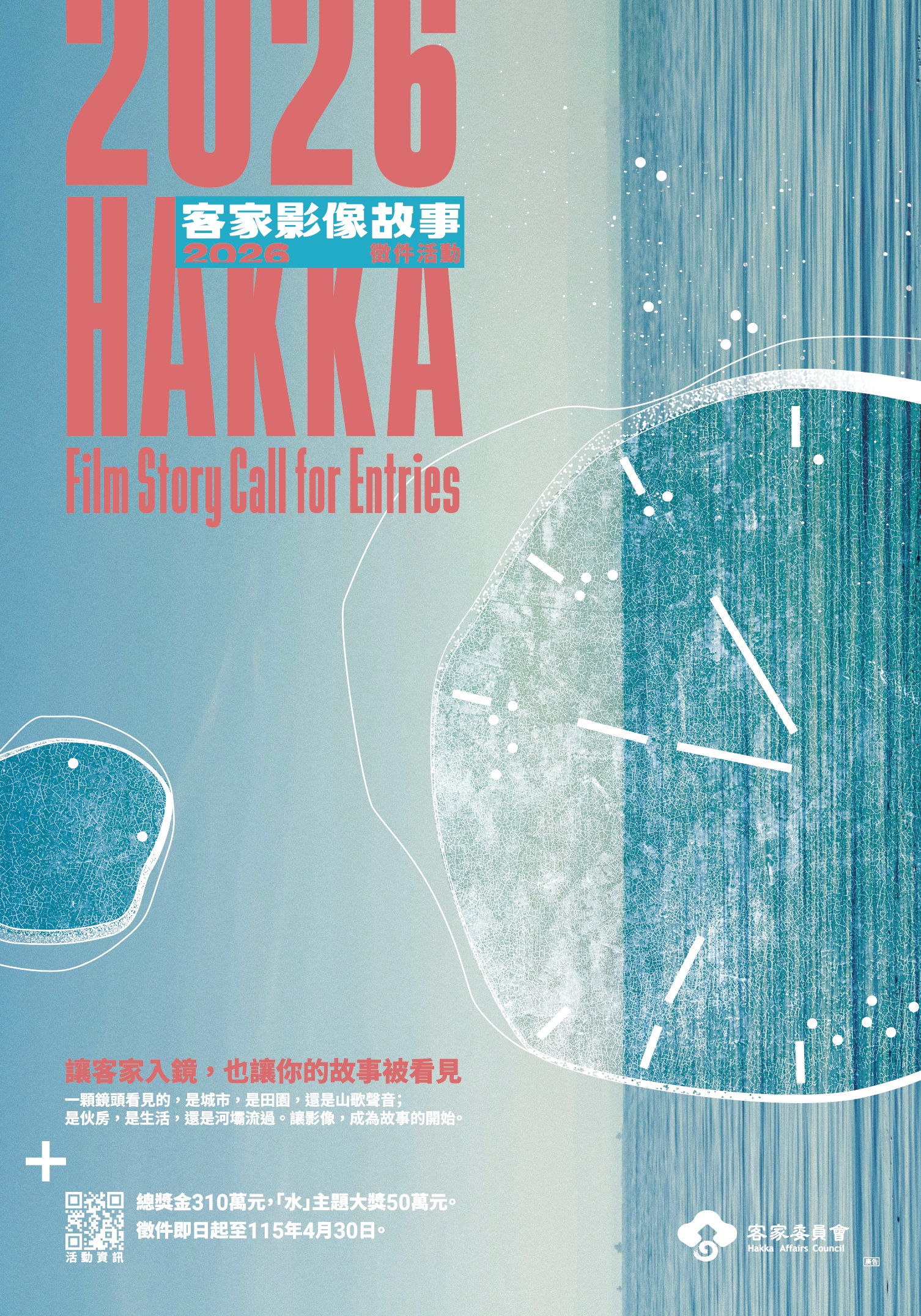本次徵件的一大亮點為年度主題「水」。客委會指出,客家聚落的發展與水源息息相關,參賽者若能以桃園埤塘、苗栗穿龍圳、屏東萬巒五溝水等水圳、溪流或水源故事為創作題材,展現客家與自然共生的連結,將有機會獨得高達50萬元的「年度水主題大獎」。