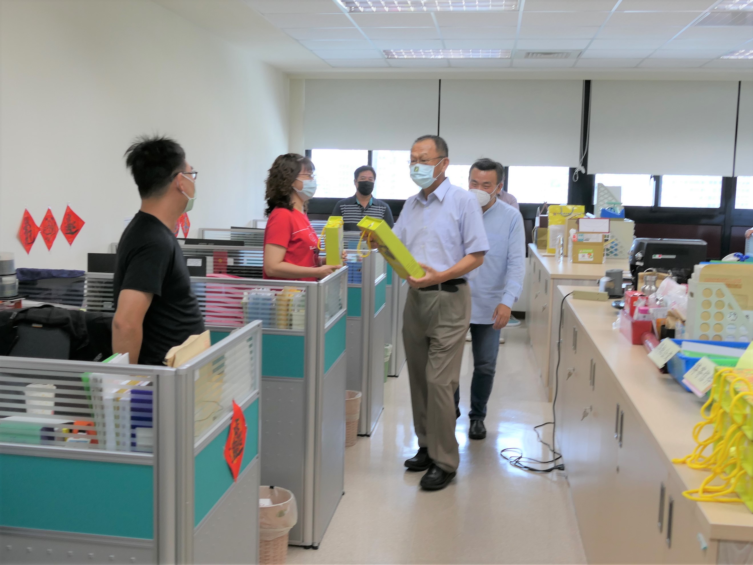 陳文亮及許乃文二位副執行長在中秋前夕,代行政院蘇貞昌院長於中心逐樓層一一發送秋禮盒給同仁,及各合署辦公業務單位主管,親手致贈最大心意,讓同仁備感溫馨。