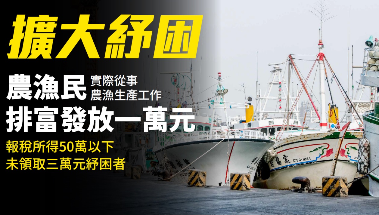 第二類是「申報稅所得50萬元以下,未領取3萬元紓困,實際從事農漁生產工作的農漁民」,在排富情形下,將發放1萬元,此類農漁民需攜帶身分證向農會或漁會辦理,5月11日起開放申請。