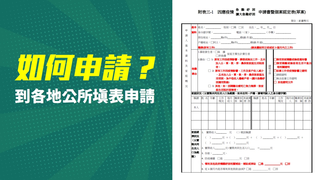 相關申請,第一類民眾可洽居住地或戶籍所在地公所洽詢,第二類農漁民可洽農漁會或來電行政院南部聯合服務中心07-7150300分機268、270詢問詳細內容,南服中心官網也隨時提供民眾相關紓困補助資訊。