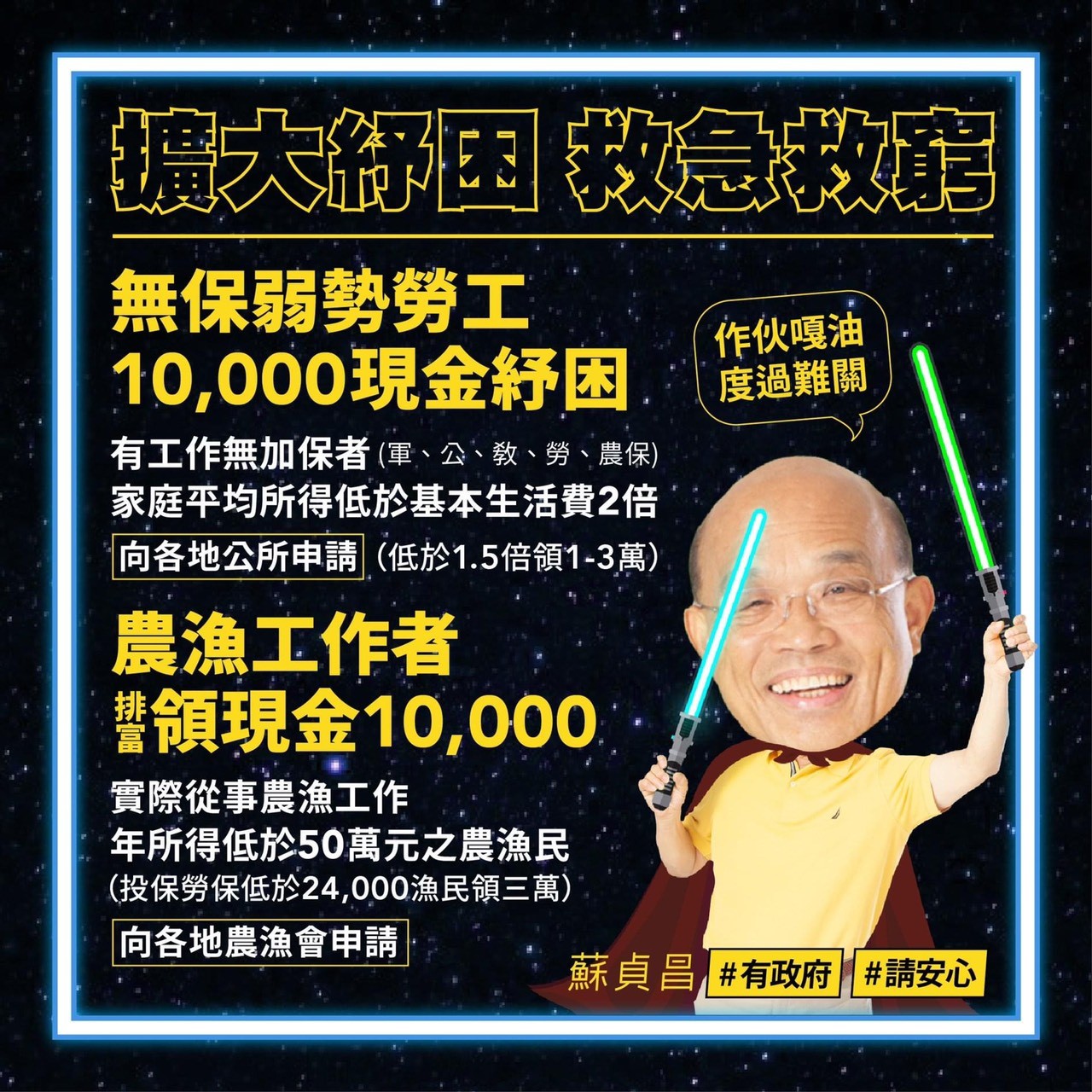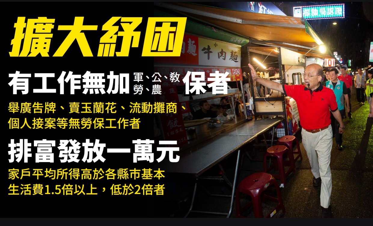 行政院4日加碼紓困兩類族群,一類為「有工作,無加保者」,一類為「實際從事農漁生產工作者」,可排富獲得補助1萬元。