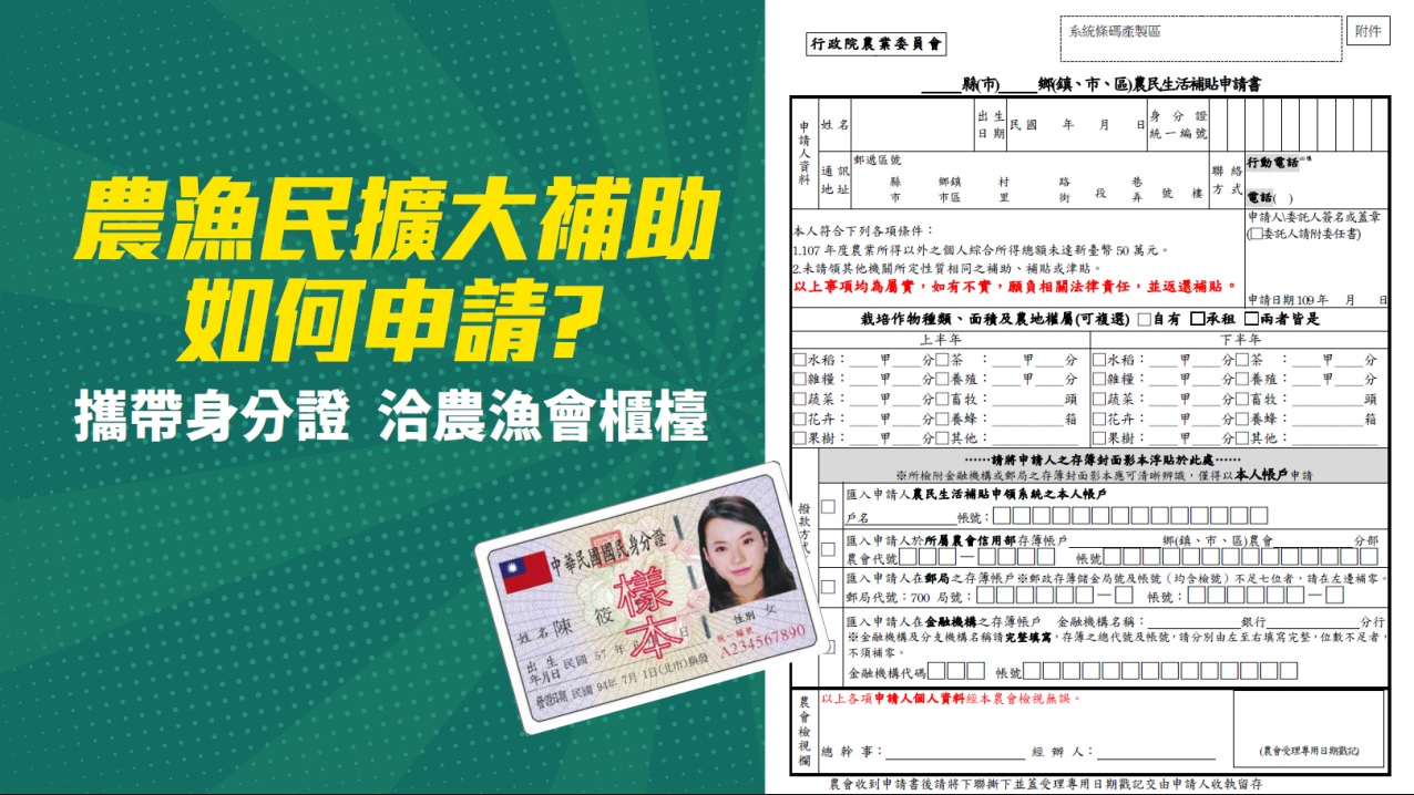 申請補貼的農漁民須具備下列條件之一,2020年3月31日前已參加農民健康保險,且申請補貼時仍加保中的農民;參加農民職業災害保險或農委會農糧政策的農民;持有農委會各區農改場所核發實際耕作證明書的農民;2020年3月31日前已加入漁會甲類會員,且申請補貼時仍具甲類會員身份的漁民。