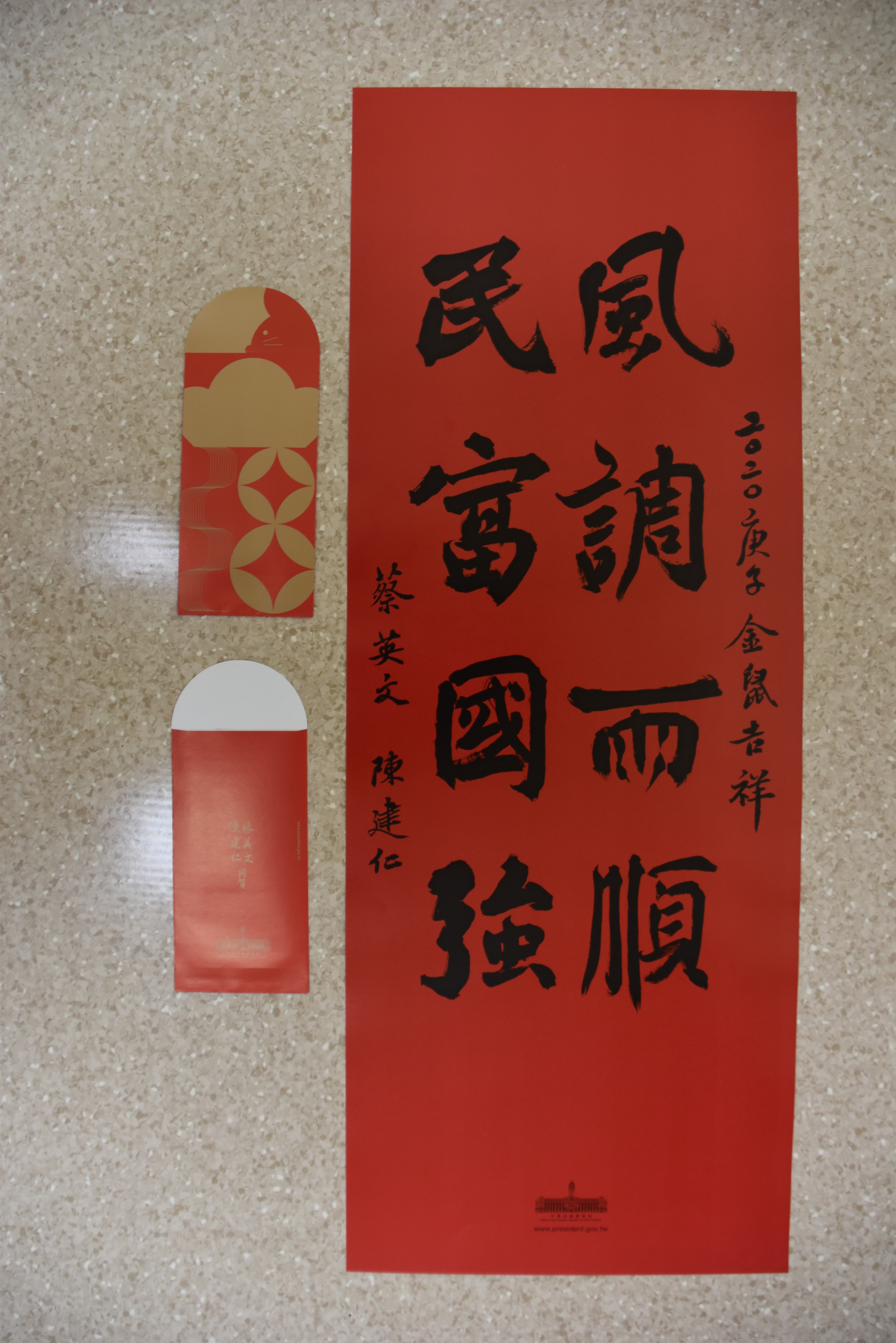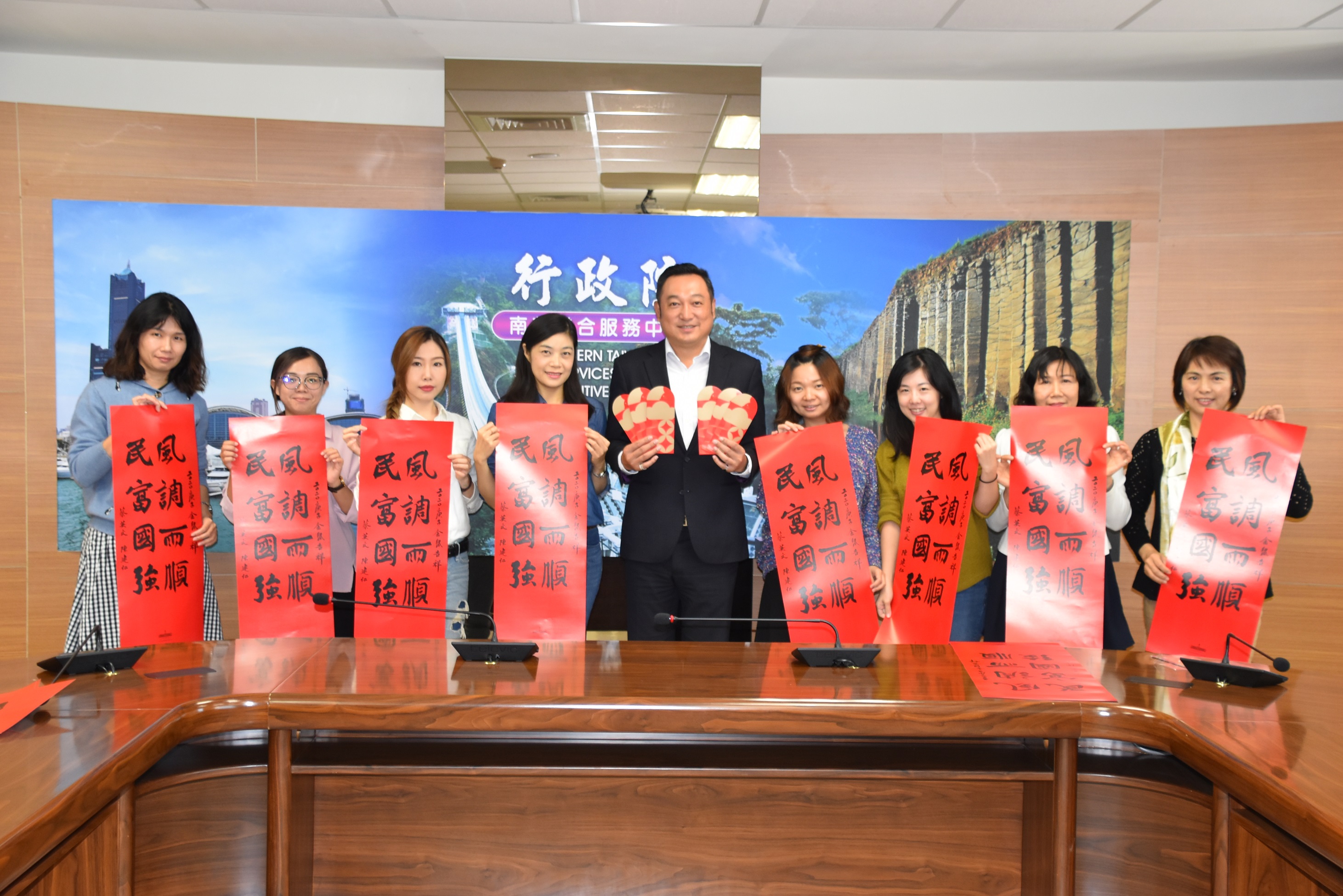 迎接2020鼠年到來,行政院南部聯合服務中心自即日起上班時間,在中心8樓發送由總統蔡英文及副總統陳建仁聯合署名「風調雨順 民富國強」春聯及紅包袋,歡迎民眾索取,數量有限,送完為止。