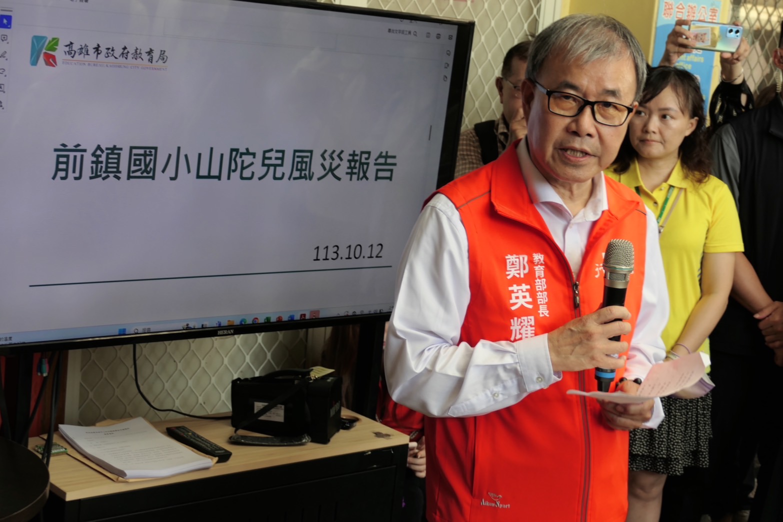 卓院長到場後,首先聽取前鎮國小謝惠君校長說明此次山陀兒颱風造成前鎮國小災損情形,包括活動中心窗框及走廊天花板輕鋼架崩落、廁所水泥剝落及天花板損壞、校區公共藝術景觀損毀等,盼請中央協助核撥災損補助經費;而目前該校已與市府團隊、全校師生共同協力完成通學步道暢通無阻、校園環境清潔消毒。
