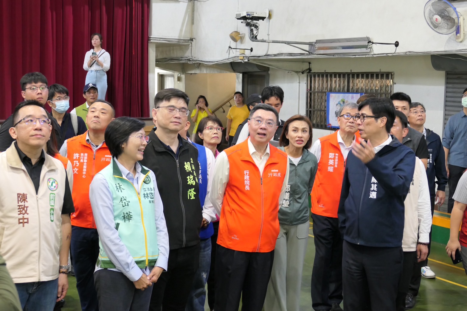 致詞結束後,卓院長偕同行政院李慧芝發言人、教育部鄭英耀部長、經濟部郭智輝部長、行政院南部聯合服務中心許乃文執行長、謝文斌副執行長、教育部國教署戴淑芬副署長、林岱樺立委、邱議瑩立委、許智傑立委、賴瑞隆立委、高雄市陳其邁市長、吳立森局長等人,現地視察該校活動中心及勤學樓廁所災損情形、勤學樓走廊前大草皮周圍校樹傾倒情形、懷德樓五年一班教室及廁所修復情形。