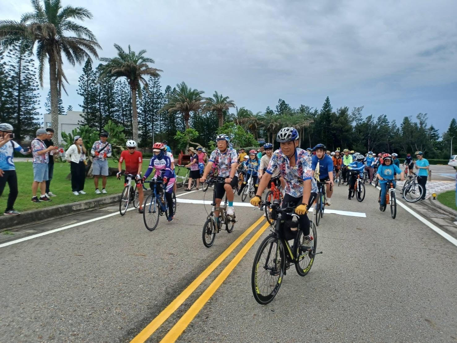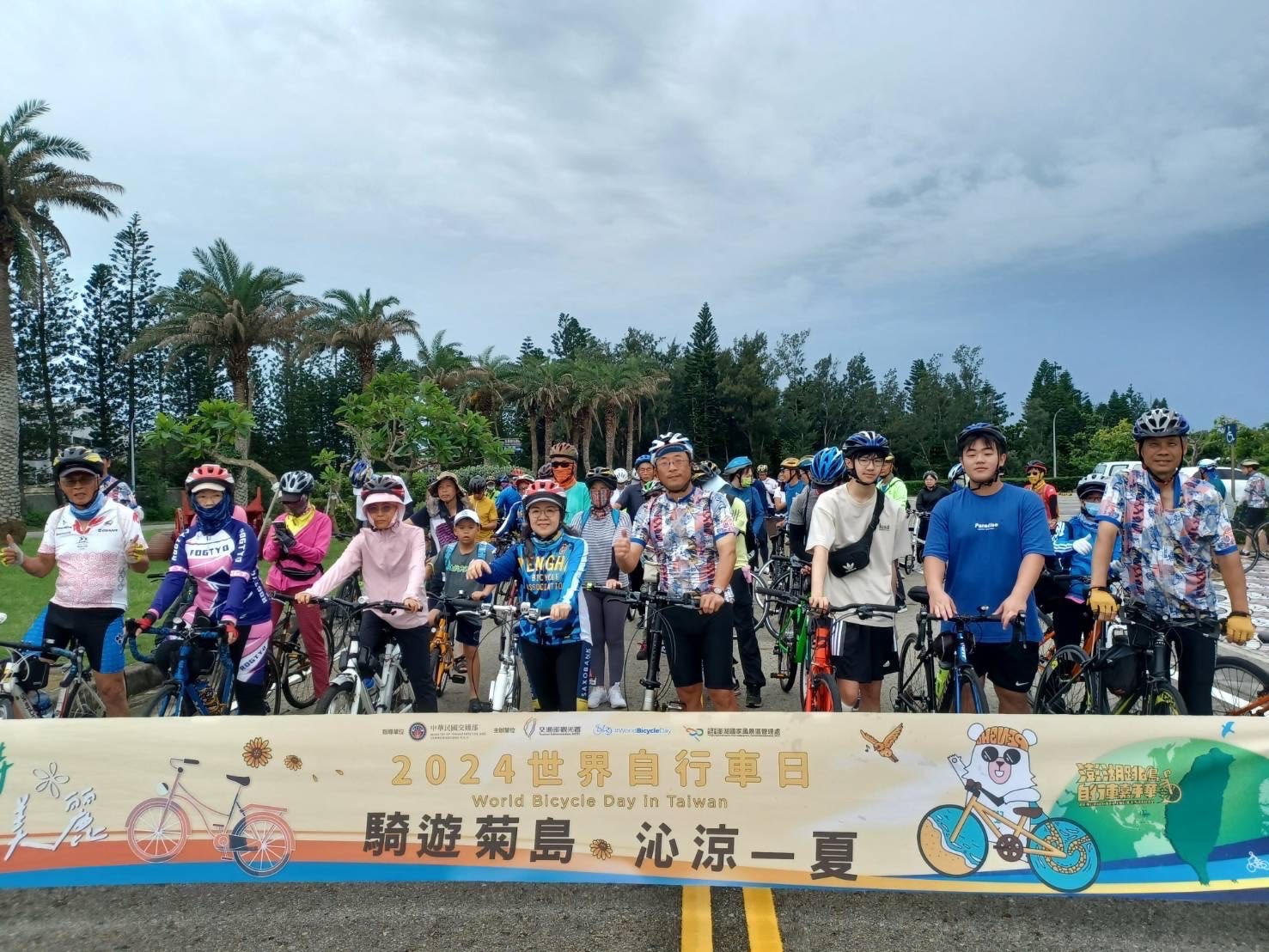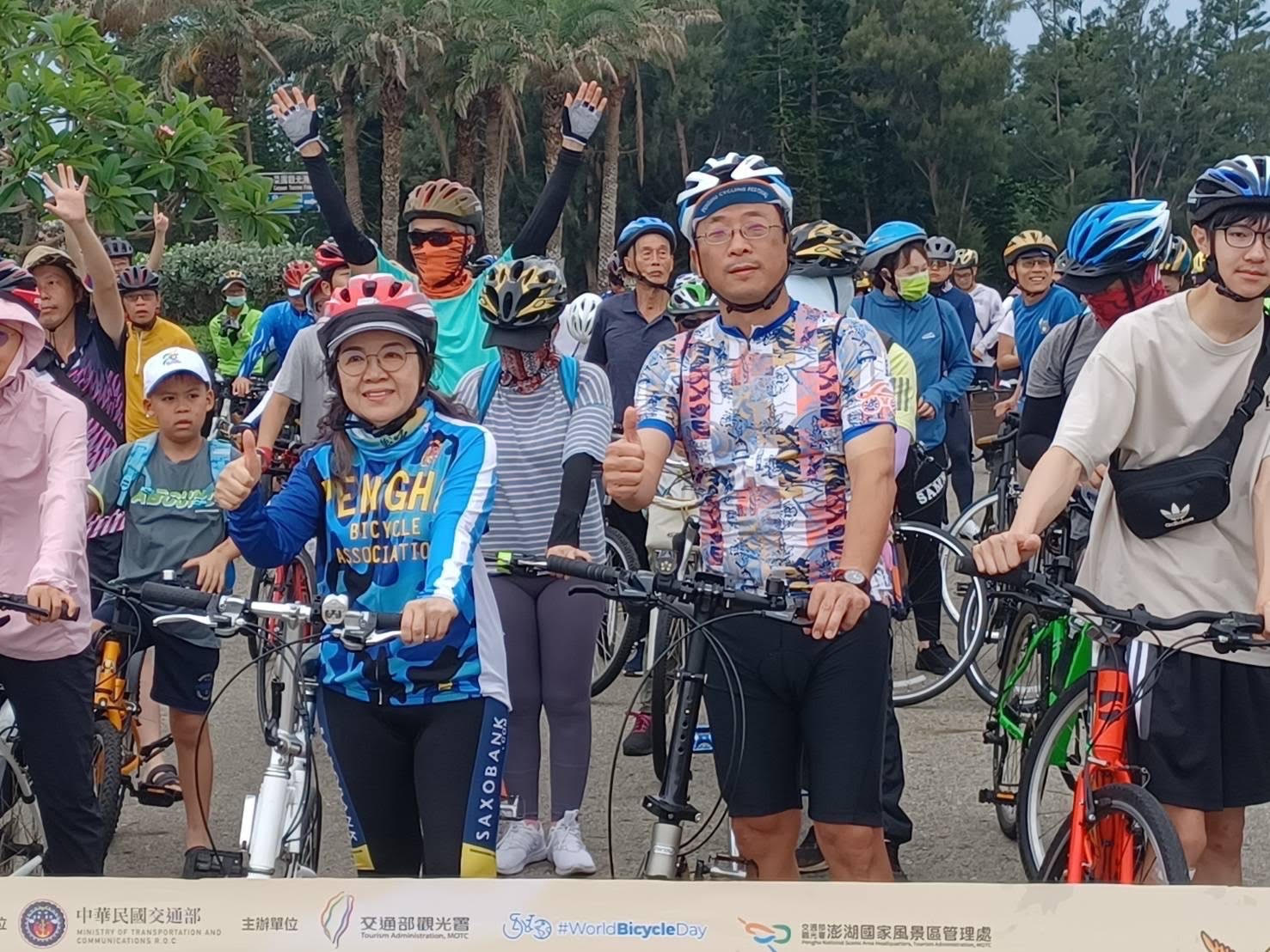 交通部觀光署澎湖國家風景區管理處為響應6月3日為世界自行車日,同時宣傳台灣自行車低碳旅遊特色,於今(1)日配合全國同步,舉行「騎遊菊島沁涼一夏」活動,100多名車友在澎管處長洪志光、行政院南服中心副執行長陳慧玲一路領騎帶領下騎行20公里,與全台46個站點合作拼湊出台灣自行車環島路線的軌跡圖形。