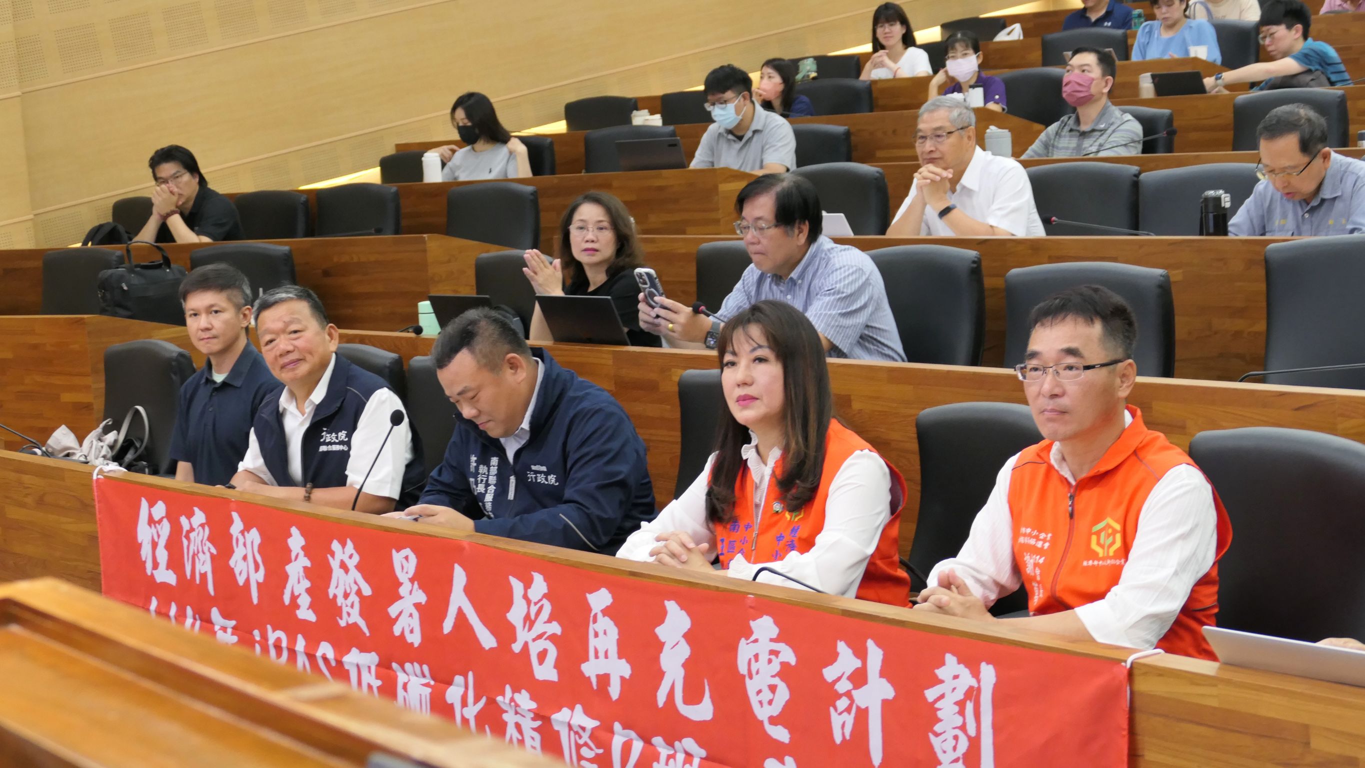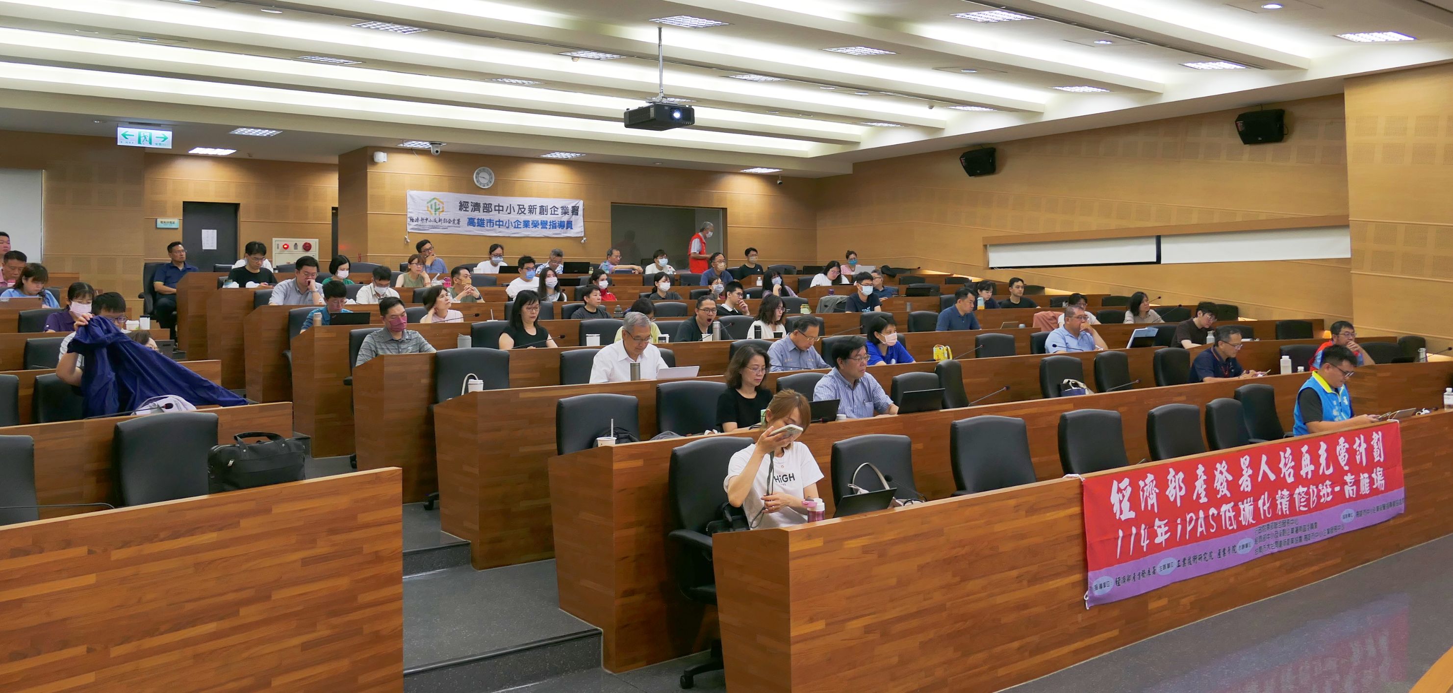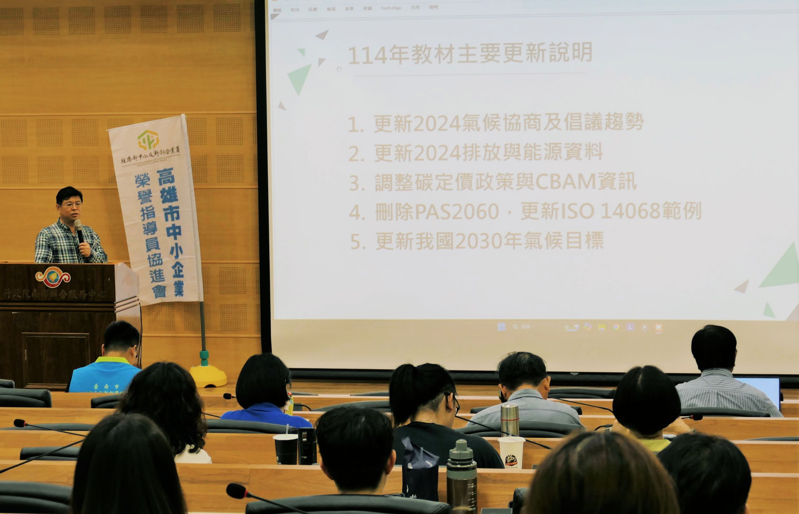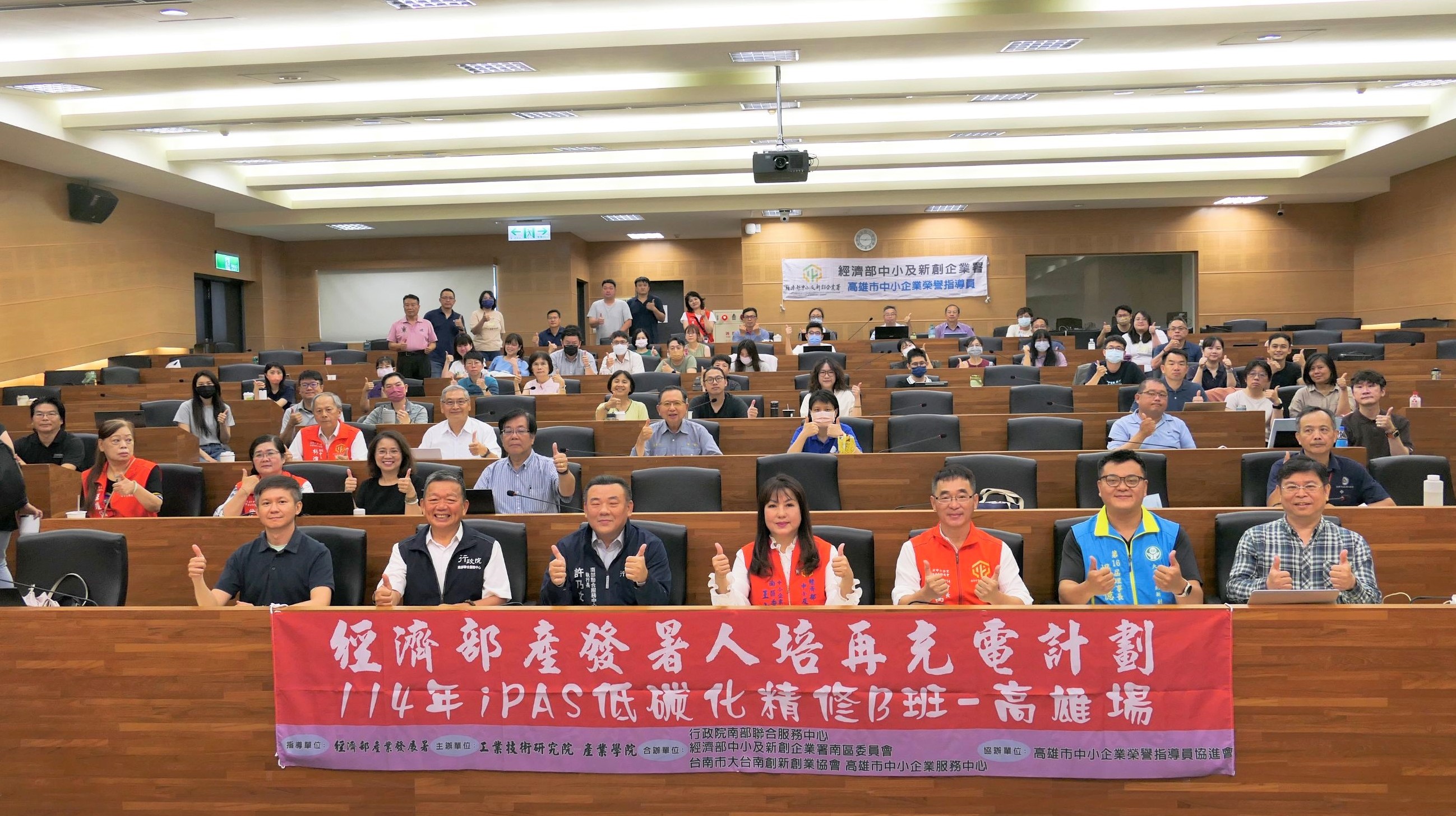 本次研習出席貴賓包含南服中心執行長許乃文、經濟部中小及新創企業署主任林進添、中小企業榮指員南區委員會主委王小珍,高雄市中小企業榮協會會長謝萬凰、經濟部產業發展署主任胡譯中和大台南新創協會理事長楊世億,共同為推動產業淨零減碳盡一份心力。