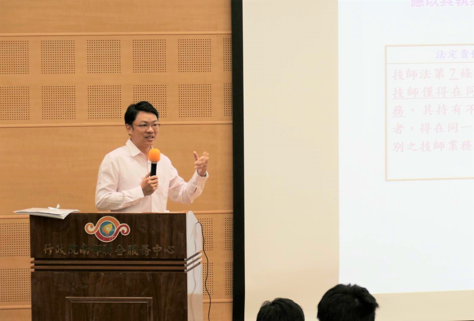 技師執行業務與民眾生命、財產及安全關係密切,終身學習、與時俱進是優秀技師執業的必備條件,有鑑於此,行政院南部聯合服務中心於今(22)日與行政院公共工程委員會共同辦理「113年度技師技術服務專業訓練講習」,期盼透過定期講習,強化工程界菁英的專業能力,提升工程品質與安全保障。