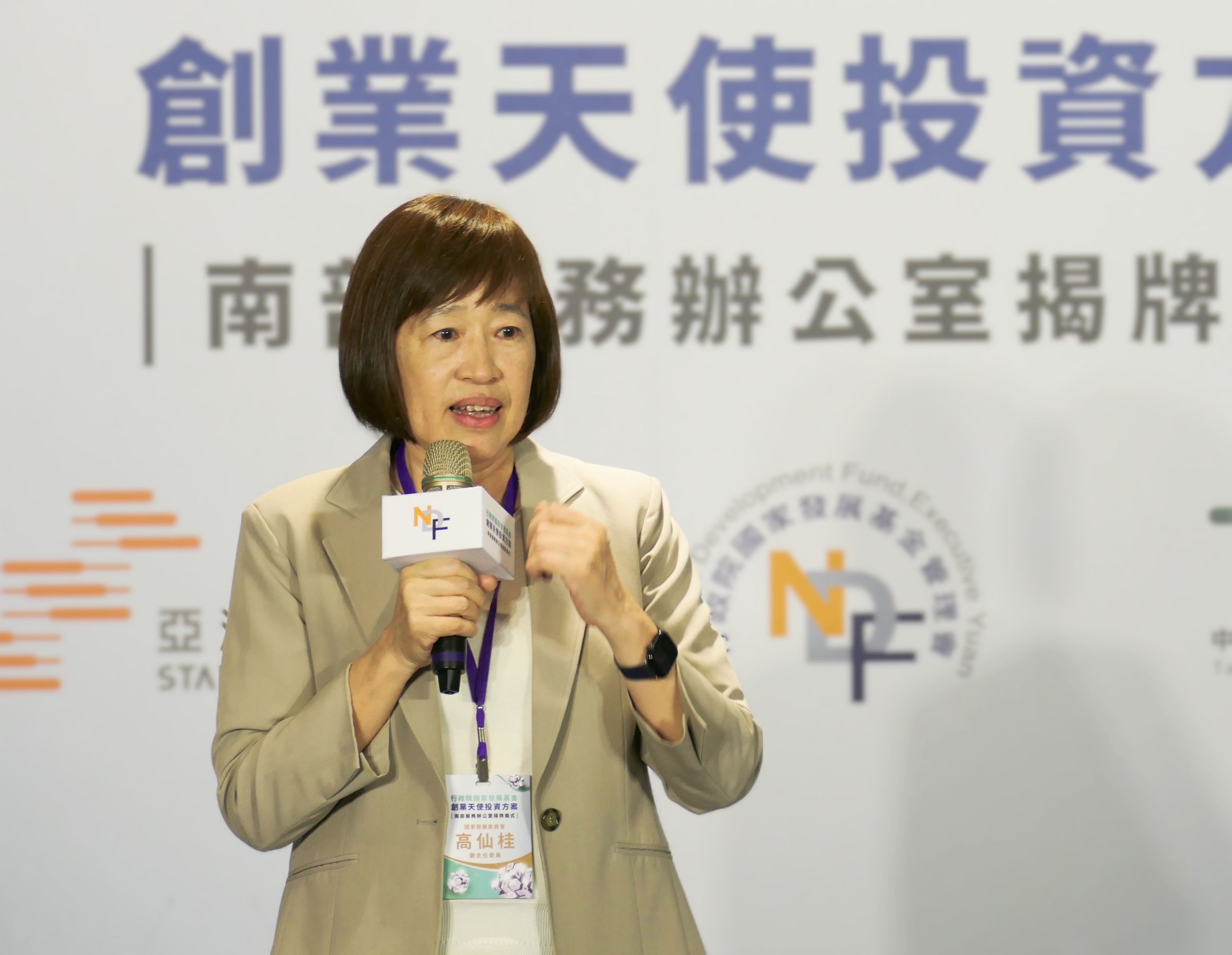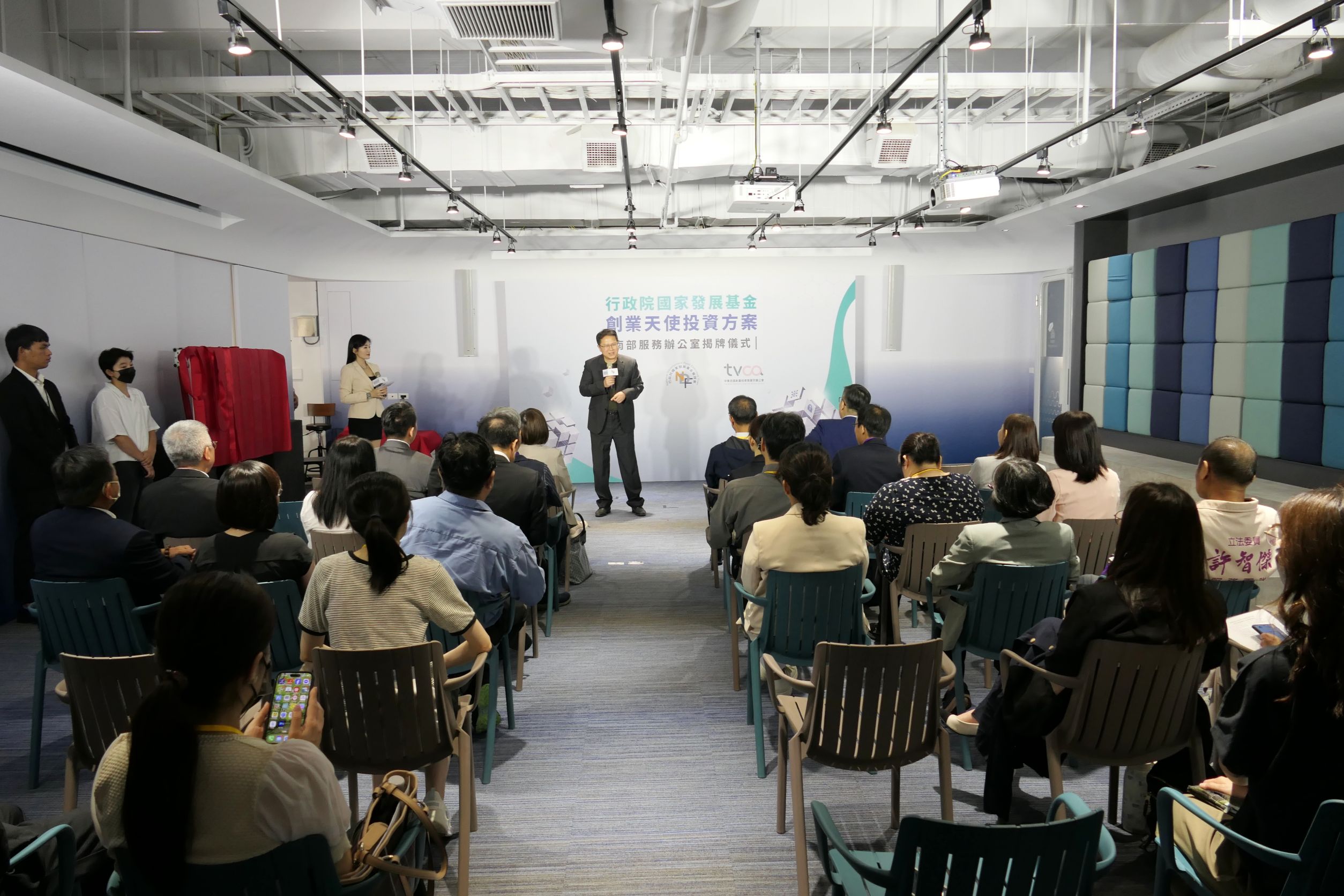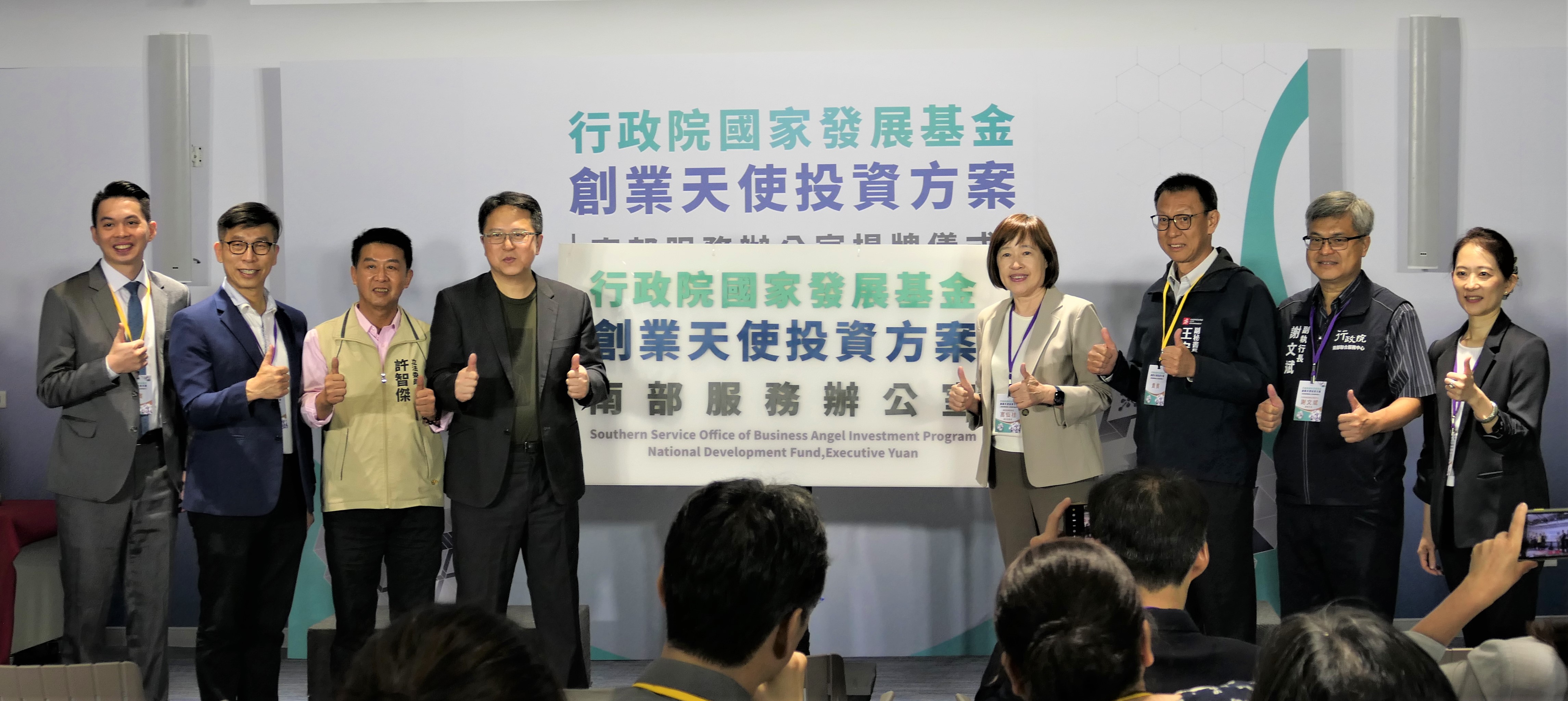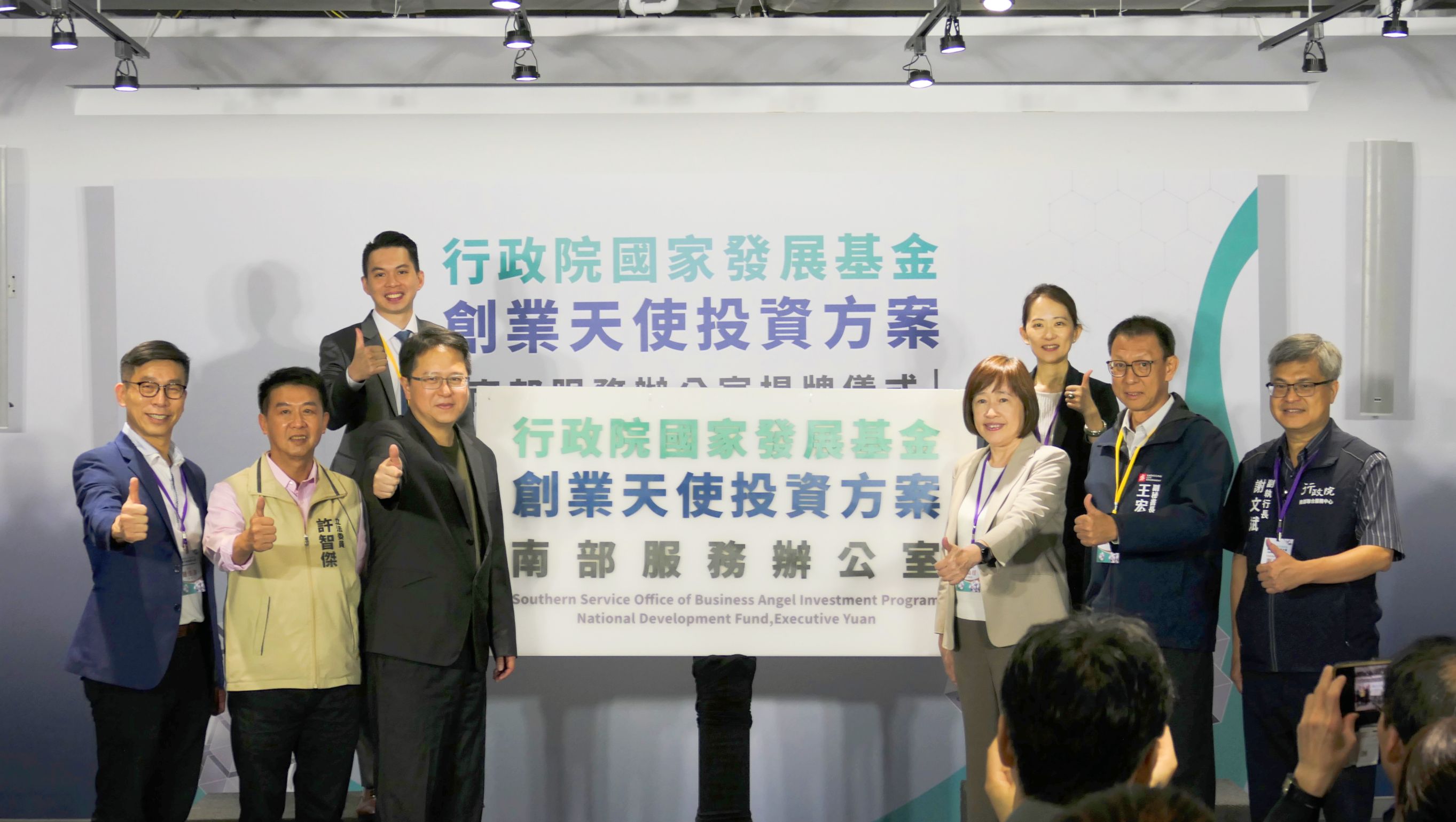 行政院國家發展基金管理會(以下稱「國發基金」)今(24)日於亞灣新創園舉辦創業天使投資方案南部服務辦公室揭牌儀式,由國發會高仙桂副主任委員、立法院邱志偉委員、許智傑委員、鍾佳濱委員、行政院南部聯合服務中心謝文斌副執行長、高雄市政府王宏榮副秘書長、創投公會謝睿哲秘書長等人共同揭牌一同見證。
