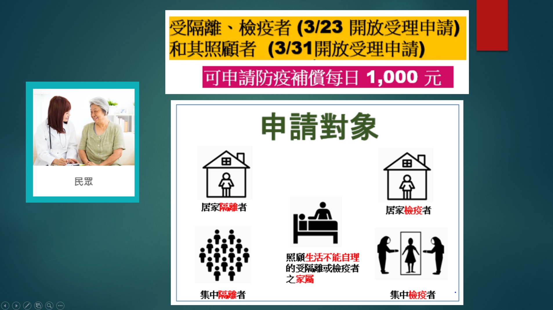 至於照顧不能自理隔離檢疫者補償金,則自3月31日起開放受理申請,如果照顧者原本即無工作,包括退休、待業或家管等情形,就不符合照顧者防疫補償申請資格。此外,照顧者必須是二親等內的血親、姻親或者民法規定的家長、家屬。