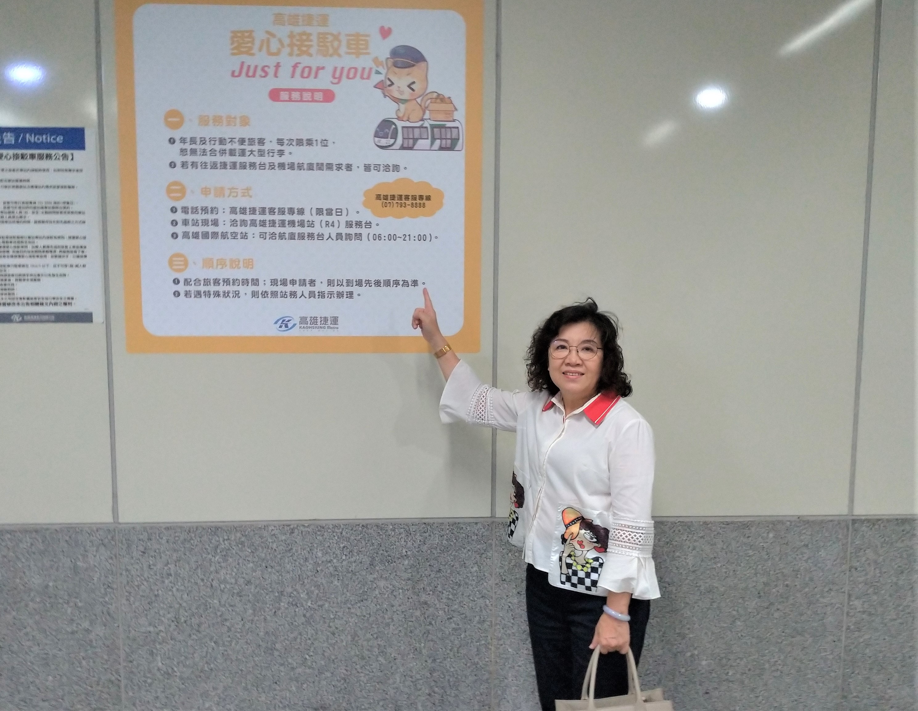 陳慧玲副執行長表示,愛心電動車接駁服務是一項相當好的便民政策,為了讓更多離島澎湖鄉親或旅客了解此服務,即邀集高捷公司與交通部民航局等單位商討,在多次溝通努力下,於交通部民用航空局高雄國際航空站在服務台新增明亮的燈箱告示,還有高雄捷運公司以「蜜柑站長」為主題,在捷運明顯處新增2處大型服務告示牌面,展現機關與企業齊心齊力透過多元管道宣傳,讓廣大乘客更了解移動式無障礙服務資訊。