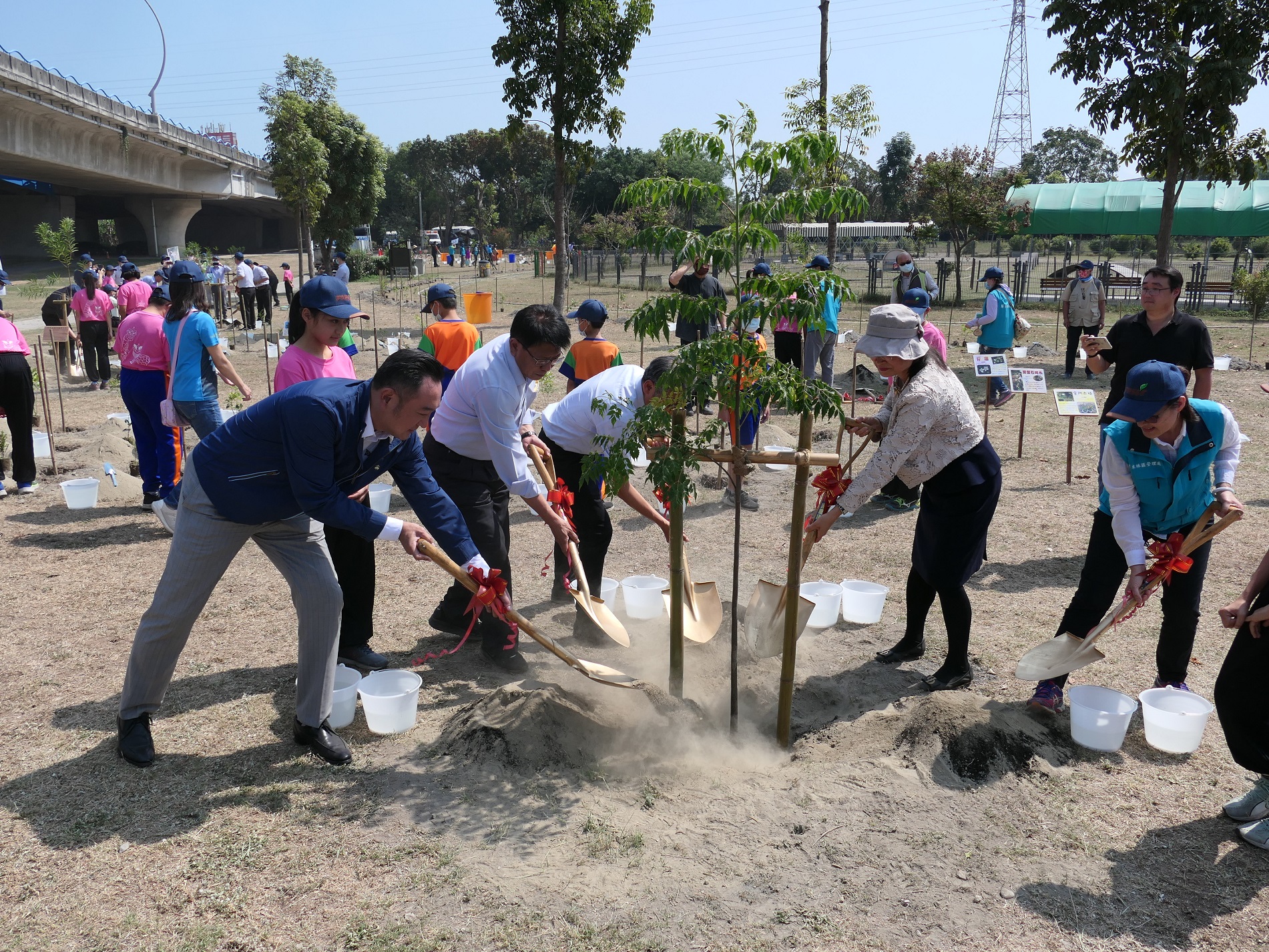 今日活動地點選在高屏溪河濱寵物運動公園,屬於高屏溪左岸高灘地,民國98年因八八風災棲地環境受到嚴重破壞,對當地生態造成很大衝擊。今日行政院南部聯合服務中心執行長陳政聞與屏東縣長潘孟安、屏東林管處處長楊瑞芬、水利署七河局局長李宗恩,還有屏東市凌雲國小及幼兒園師生們等,都來到現場共襄盛舉,一起種下相思樹、苦棟樹、月橘、金門赤楠等425株台灣原生種苗木,希望藉由植樹活動能恢復這高灘地原本的樣貌。