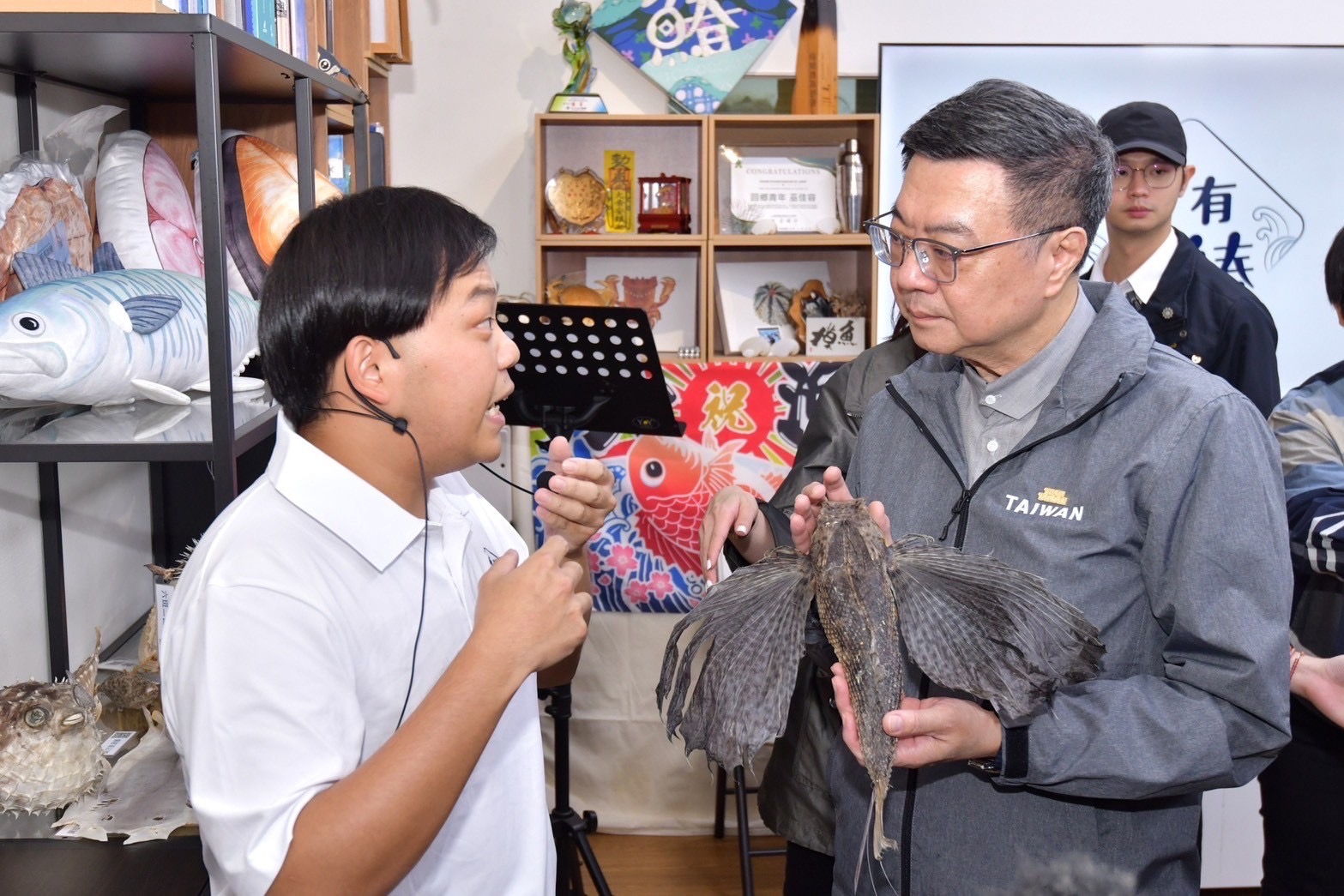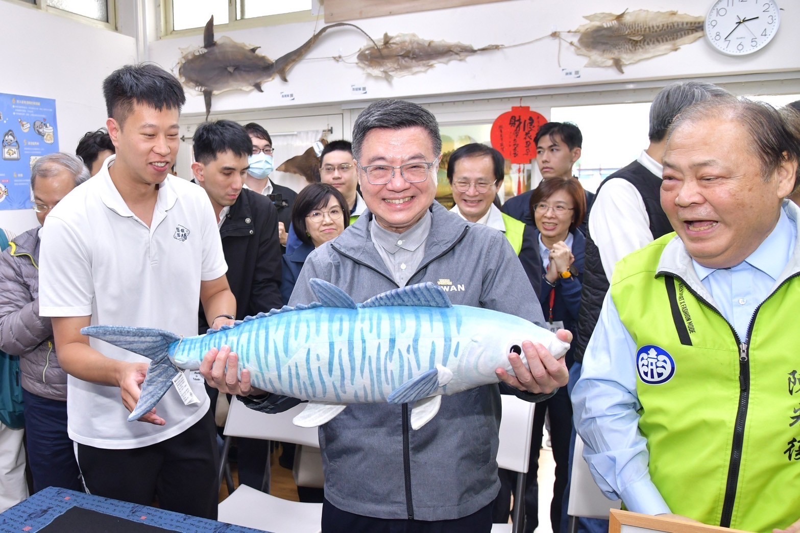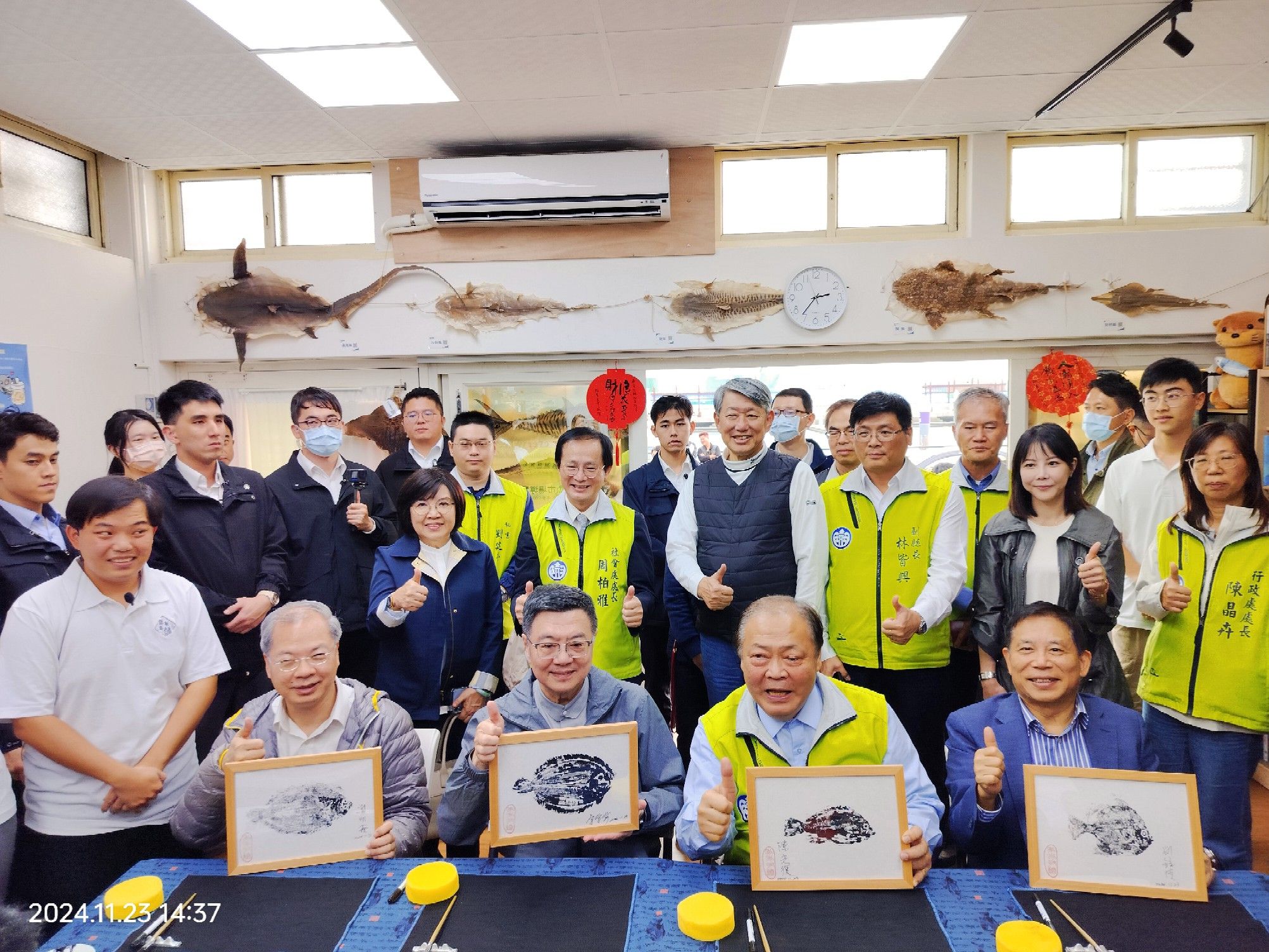 致詞結束後,卓院長偕同行政院龔明鑫秘書長、李慧芝發言人、國家發展委員會劉鏡清主委、經濟部郭智輝部長、國發會國土區域離島發展處黃文彥處長、澎湖縣陳光復縣長、行政院南部聯合服務中心陳慧玲副執行長等人,在年年有鰆活動企劃洪于正老師解說下,認識魚標本並實地體驗食魚教育的魚拓課程。最後,年年有鰆團隊特別致贈卓院長澎湖最著名魚種𩵚魠魚造型的文創娃娃。