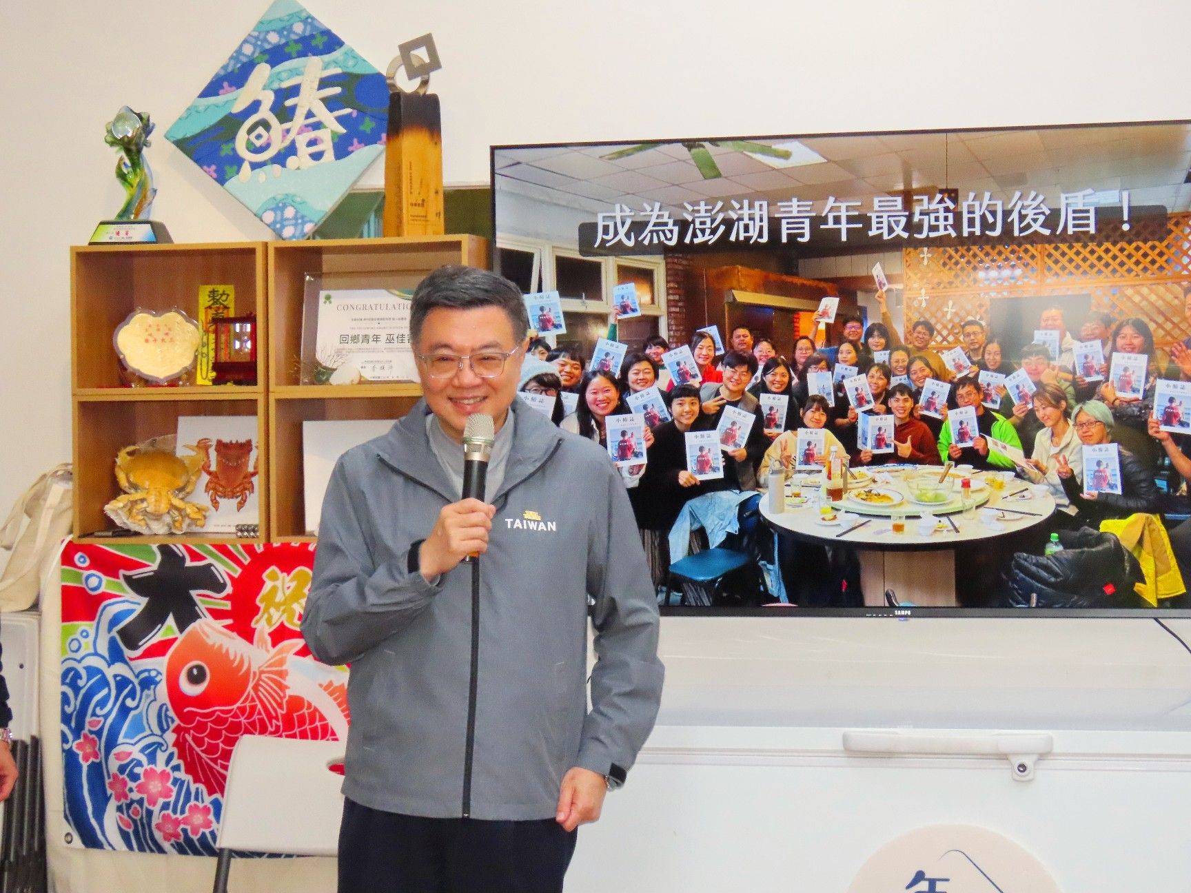卓院長說,他今日來到年年有鰆工作室,有三個畫面令他印象深刻,第一是簡報首頁有幾位年輕人坐或站在船頭的照片,展現他們與海、與地方融為一體;第二是工作室冰箱上張貼「年年有鰆」字帖,不僅是工作室的名稱,也為澎湖地方帶來福氣;第三是工作室陳列日本前內閣總理大臣岸田文雄「天真爛漫」書法作品,這是年輕人發揮創意,讓在地特色與國際連結的象徵。