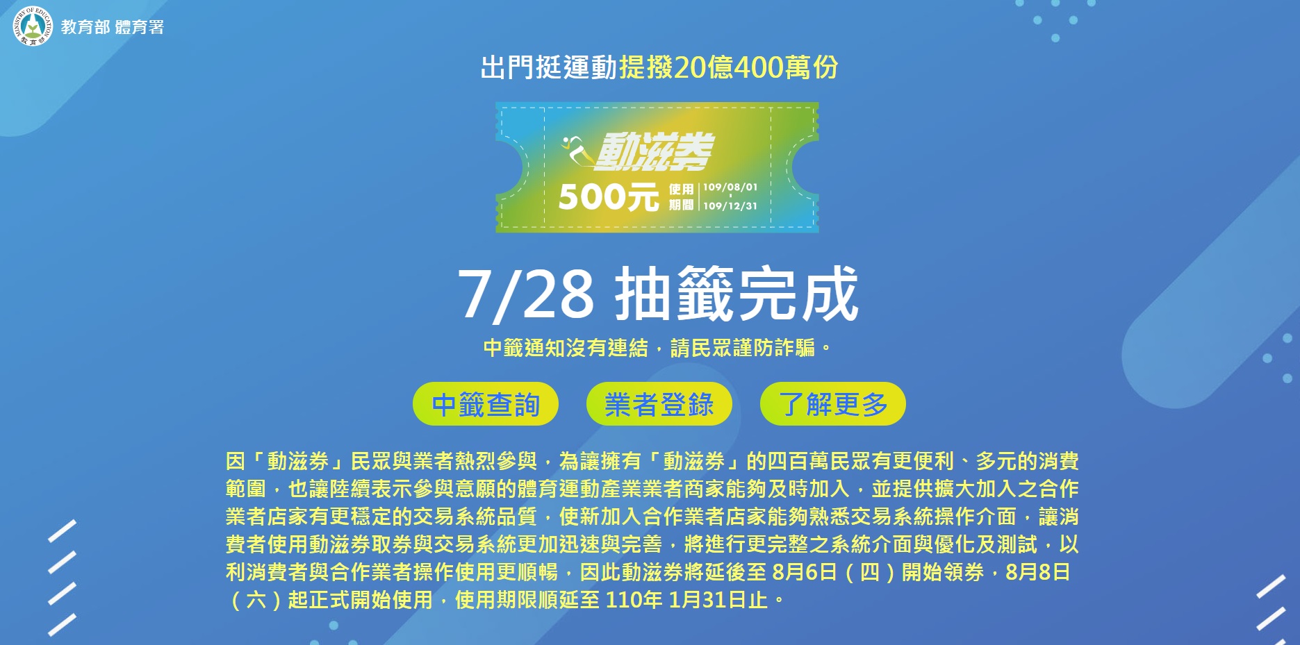 體育署今早發新聞稿表示,因「動滋券」民眾與業者熱烈參與,為讓擁有「動滋券」的四百萬民眾有更便利、多元的消費範圍,也讓陸續表示參與意願的體育運動產業業者商家能夠及時加入,因此動滋券將延後至 8月6日(四)開始領券,8月8日(六)起正式開始使用,使用期限順延至 110年 1月31日止。