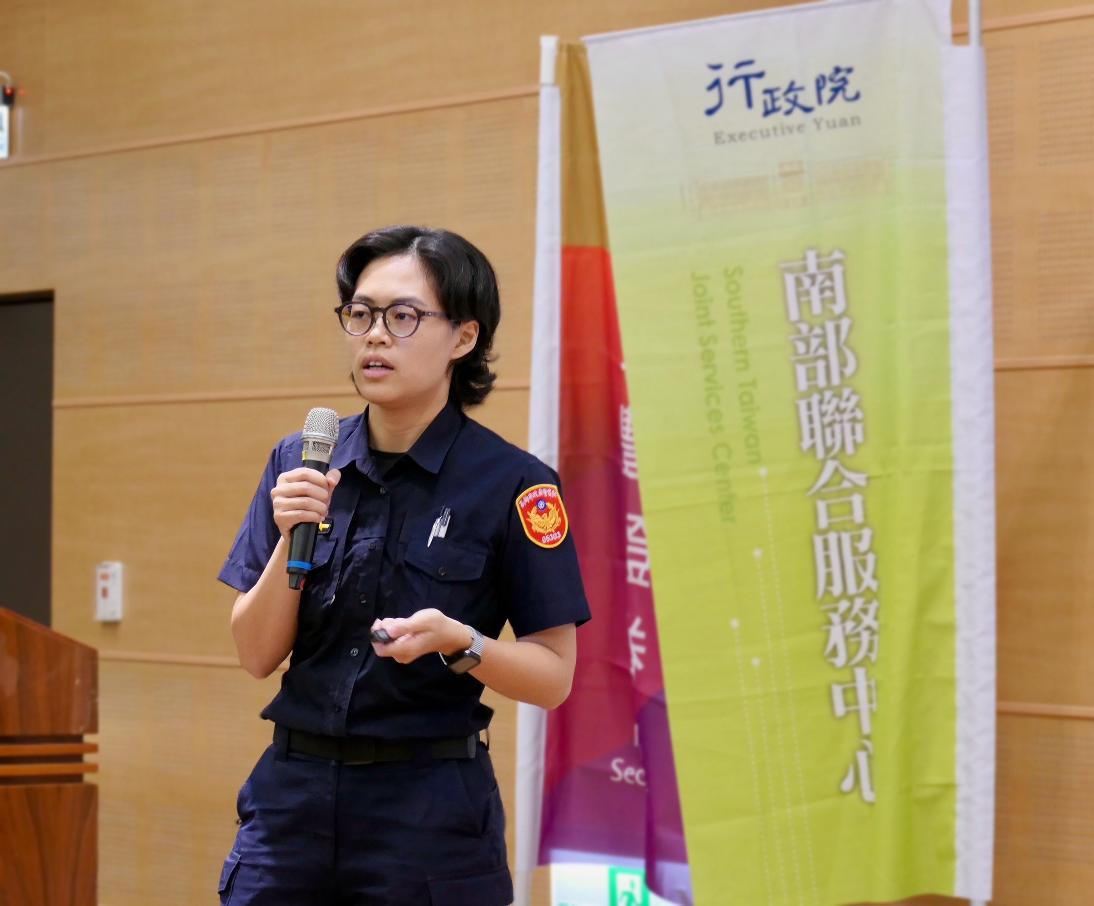 接續,苓雅分局三多派出所警員陳羽柔進行防詐宣導,說明金融詐騙手法、阻詐步驟及協防管道,並提醒民眾接獲可疑訊息或來電時,應謹記「冷靜、查證、撥打165」三大原則。