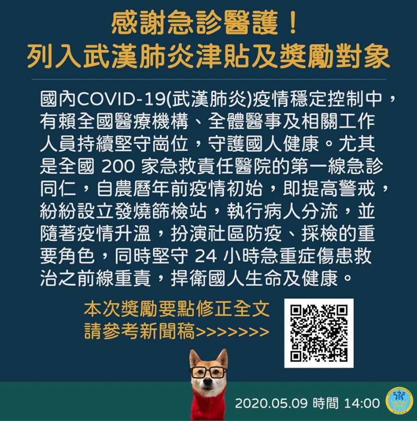 為了感謝醫護人員的辛勞,衛生福利部特別修正獎勵要點,讓急診專責照護人員納入防疫獎勵,新增醫院急診部門負壓隔離病室,或單人病室之第一線執行照護疑似或確診個案之專責醫事人員,醫師每人每日一萬元、護理人員每人每班一萬元。