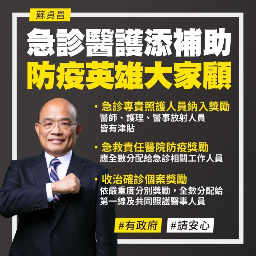 行政院長蘇貞昌表示,政府同時也新增急救責任醫院防疫獎勵和收治確診個案獎勵,這兩個獎勵都全數分配給相關工作人員,包含醫護、醫事放射人員、社會工作人員、行政人員、救護人員及清潔人員。