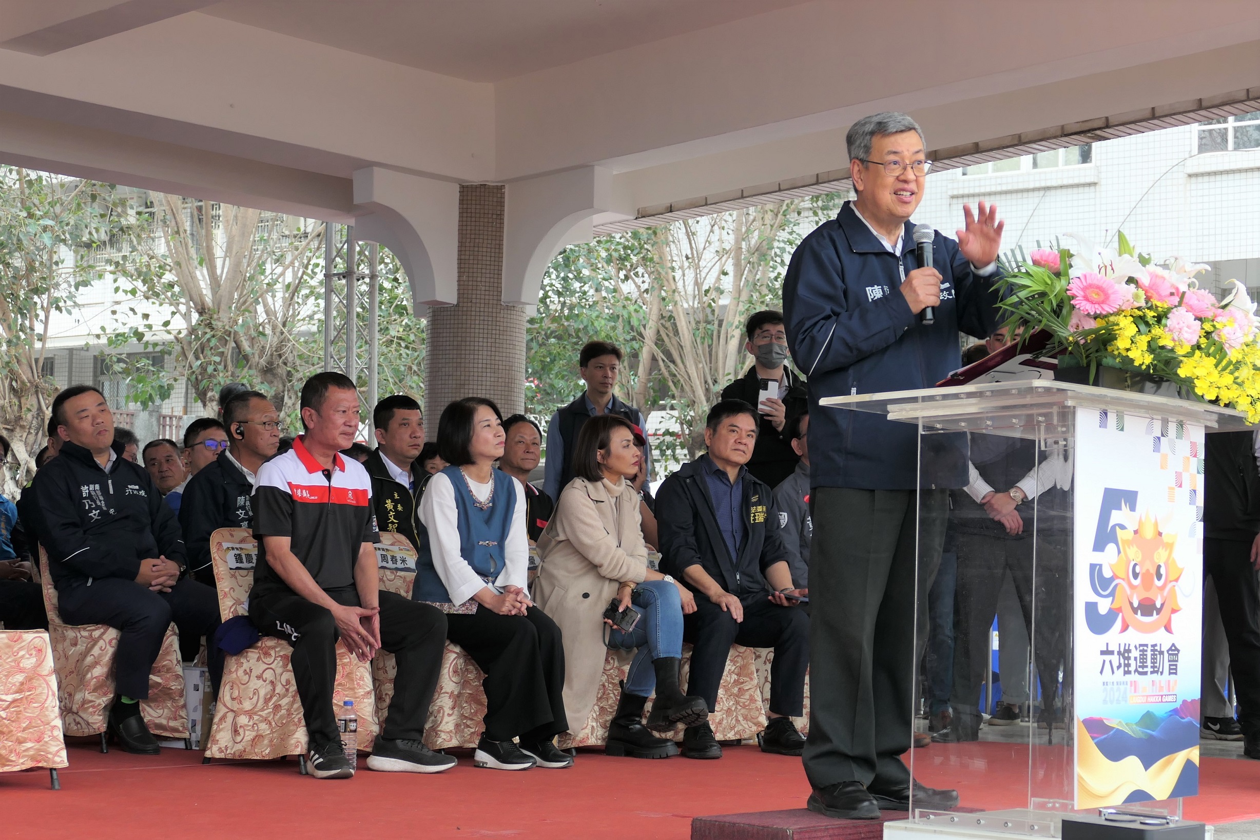 行政院長陳建仁今(9)日在行政院李孟諺秘書長、林子倫發言人、行政院南服中心許乃文及陳文亮副執行長、客家委員會楊長鎮主委、鍾佳濱立委、莊瑞雄立委、徐富癸立委、邱議瑩立委及屏東縣周春米縣長等人陪同下,前往屏東縣麟洛國中出席「第59屆六堆運動會開幕式」,陳院長表示,很高興再次參加六堆運動會,並欣見該運動會規模愈辦愈大,不斷與時俱進,他要感謝屏東12鄉區承辦人員的努力,讓生生不息、充滿活力的客家精神持續傳遞下去。