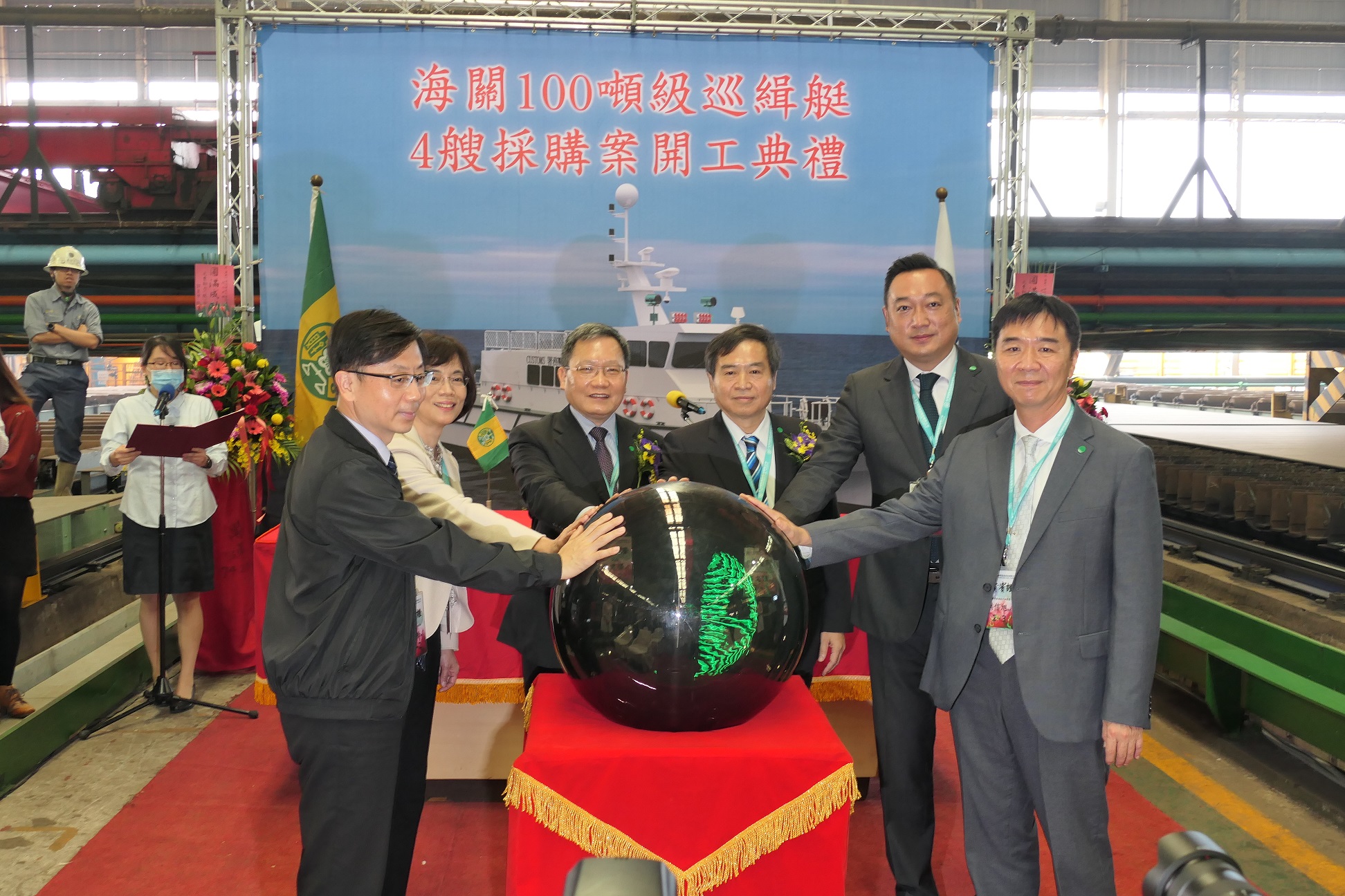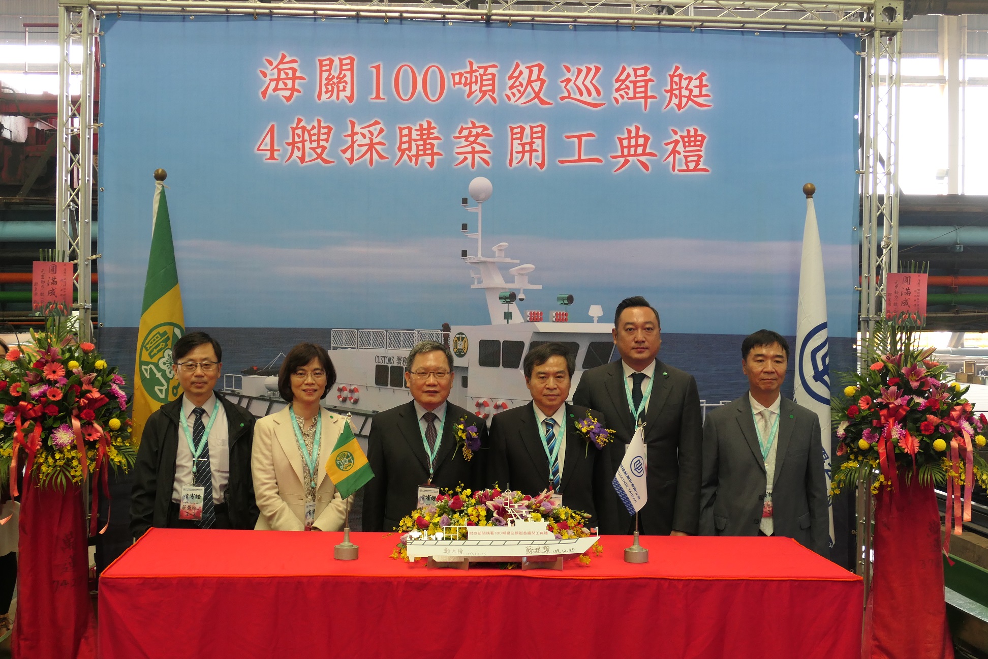 由財政部關務署委託台船建造4艘100噸級巡緝艇,今(25日)早在台船高雄廠開工,由財政部長蘇建榮及台船董事長鄭文隆共同主持,行政院南部聯合服務中心執行長陳政聞、財政部關務署署長謝鈴媛及海巡等相關查緝機關主管皆蒞臨觀禮。新的巡緝艇在機動性、操控性及速度上相當優異,未來對於邊境管控上必能發揮更大效用。