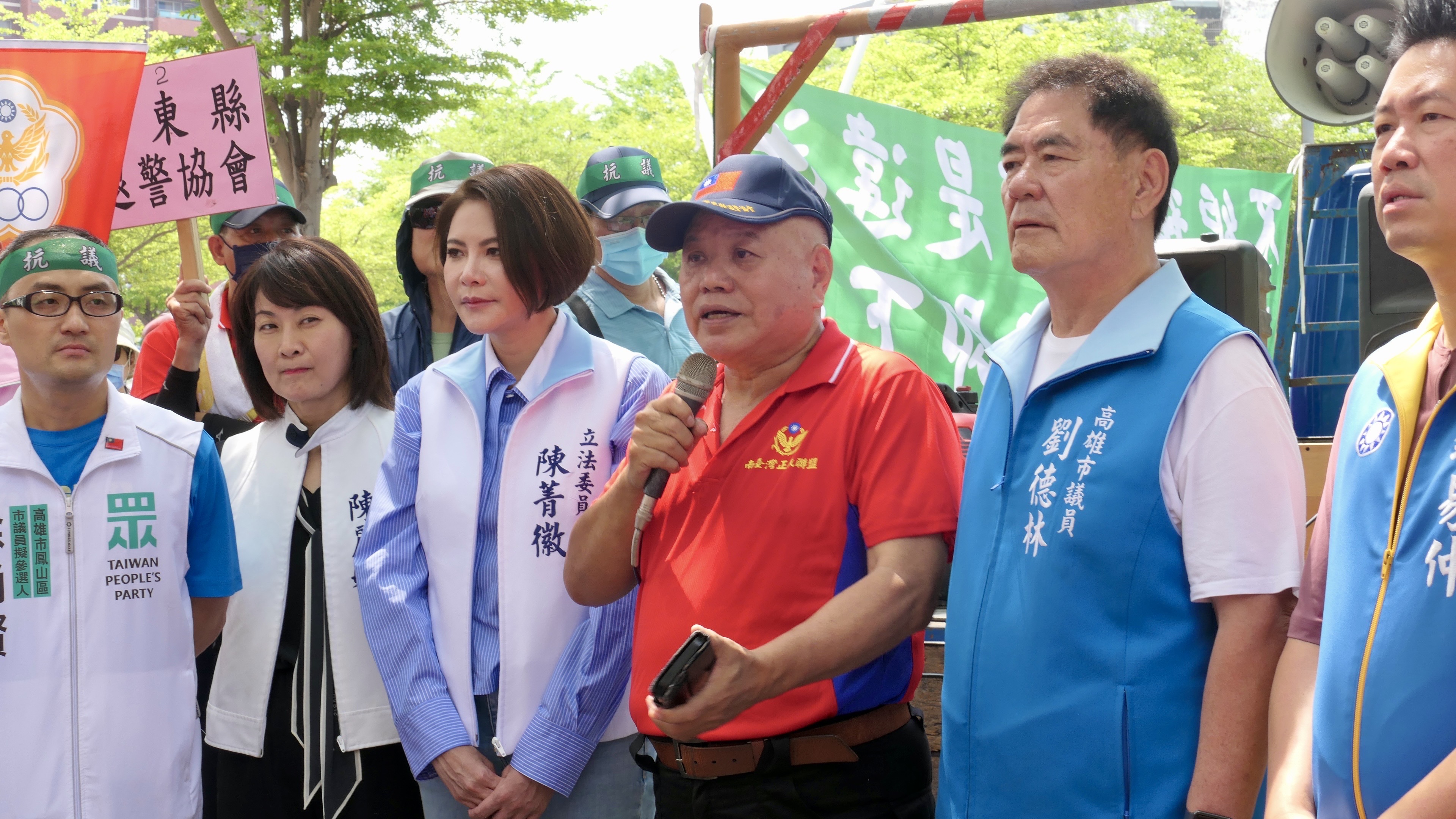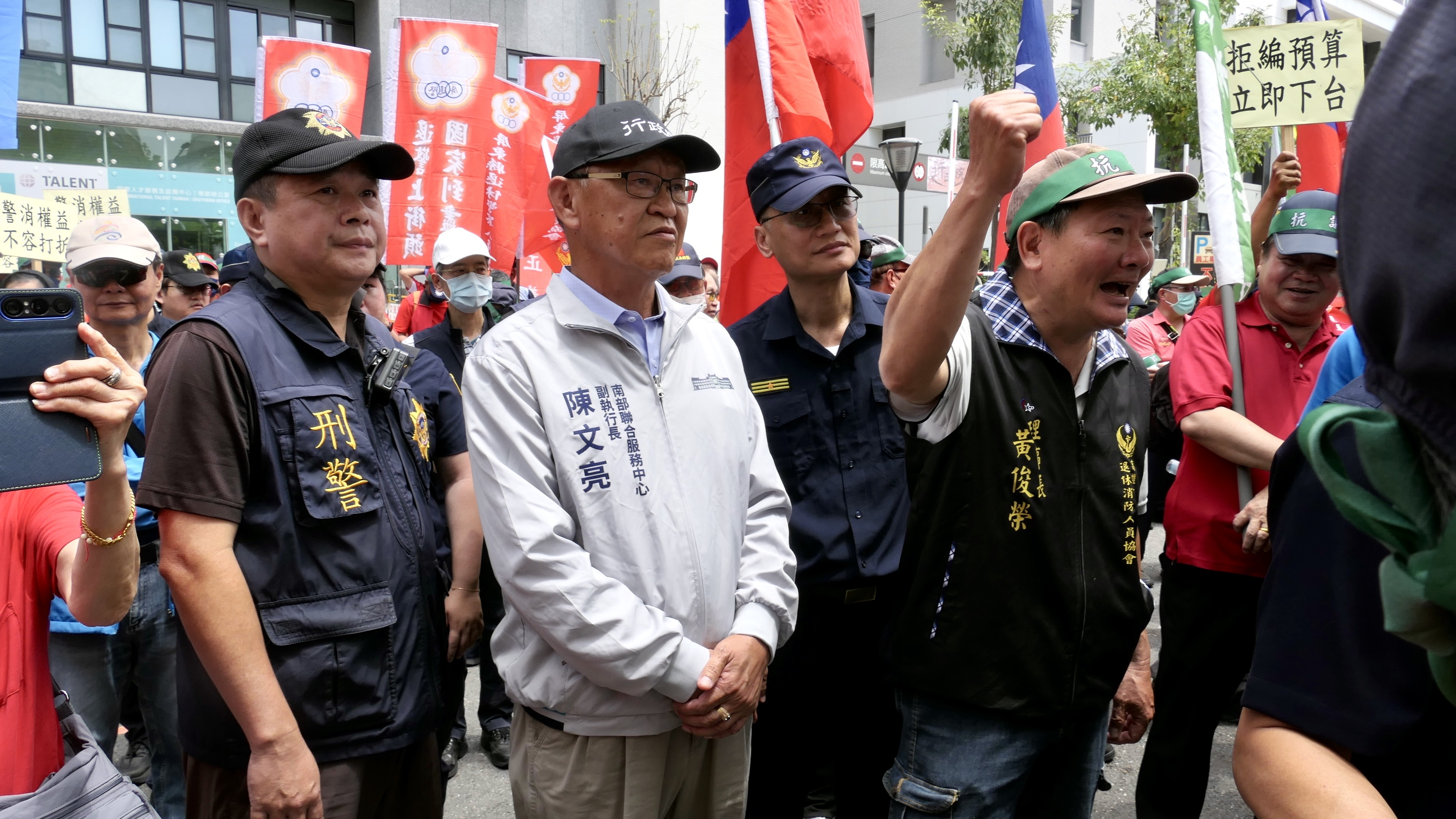 今天共有台南市、高雄市、屏東市、台東縣等縣市的退休警察人員協會到場,國民黨立委陳菁徽、市議員陳麗娜、劉德林、鍾易仲,及民眾黨議員參選人林于凱、徐尚賢等人到場。