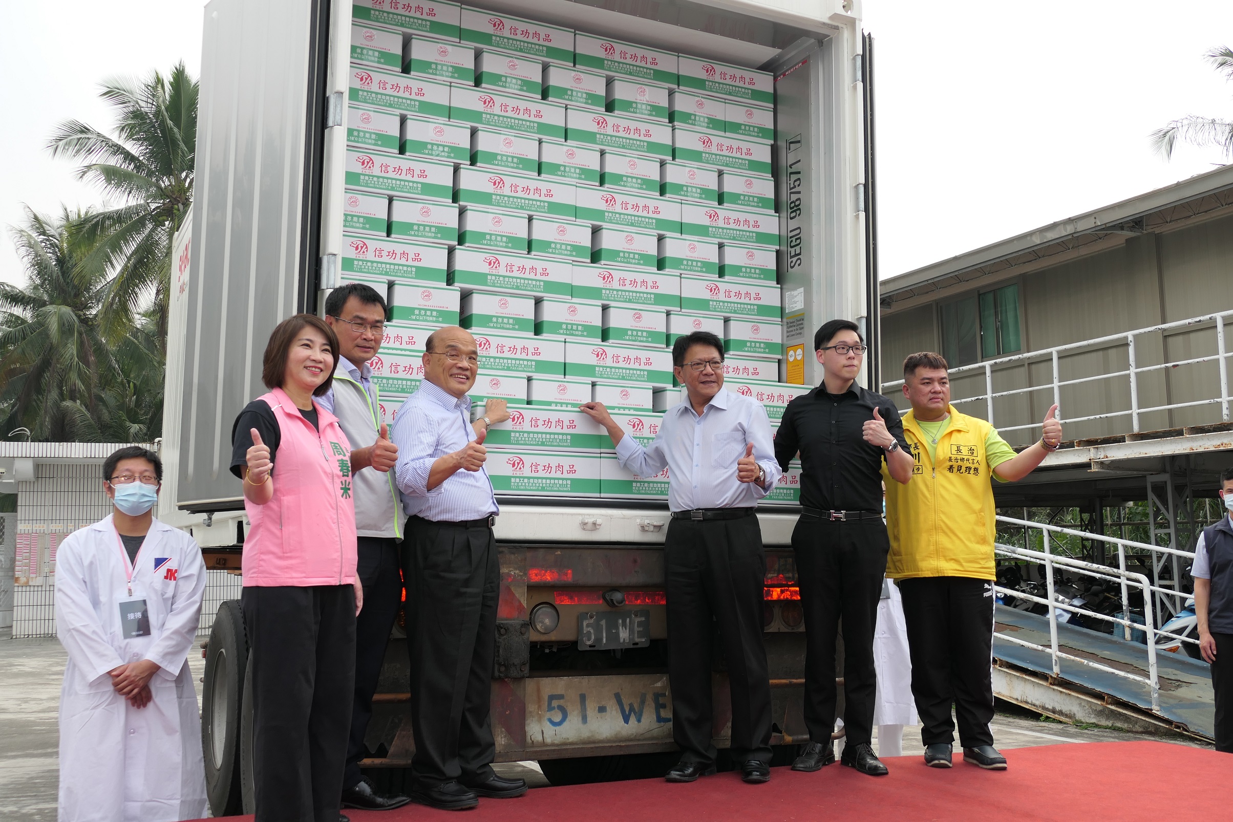 行政院長蘇貞昌19日下午在屏東縣長潘孟安、農委會主委陳吉仲、行政院南服中心副執行長許乃文、立法委員周春米等人陪同下至屏東參加信功實業公司肉品銷日封櫃儀式,院長表示,政府為捍衛臺灣豬肉,不但嚴守非洲豬瘟,去(108)年口蹄疫也成功拔針;而為重返世界讓臺灣豬肉出口,提供百億基金升級養豬設備,並建置冷鏈技術,讓農產品可再升級、再出口,希望扶植整個產業。