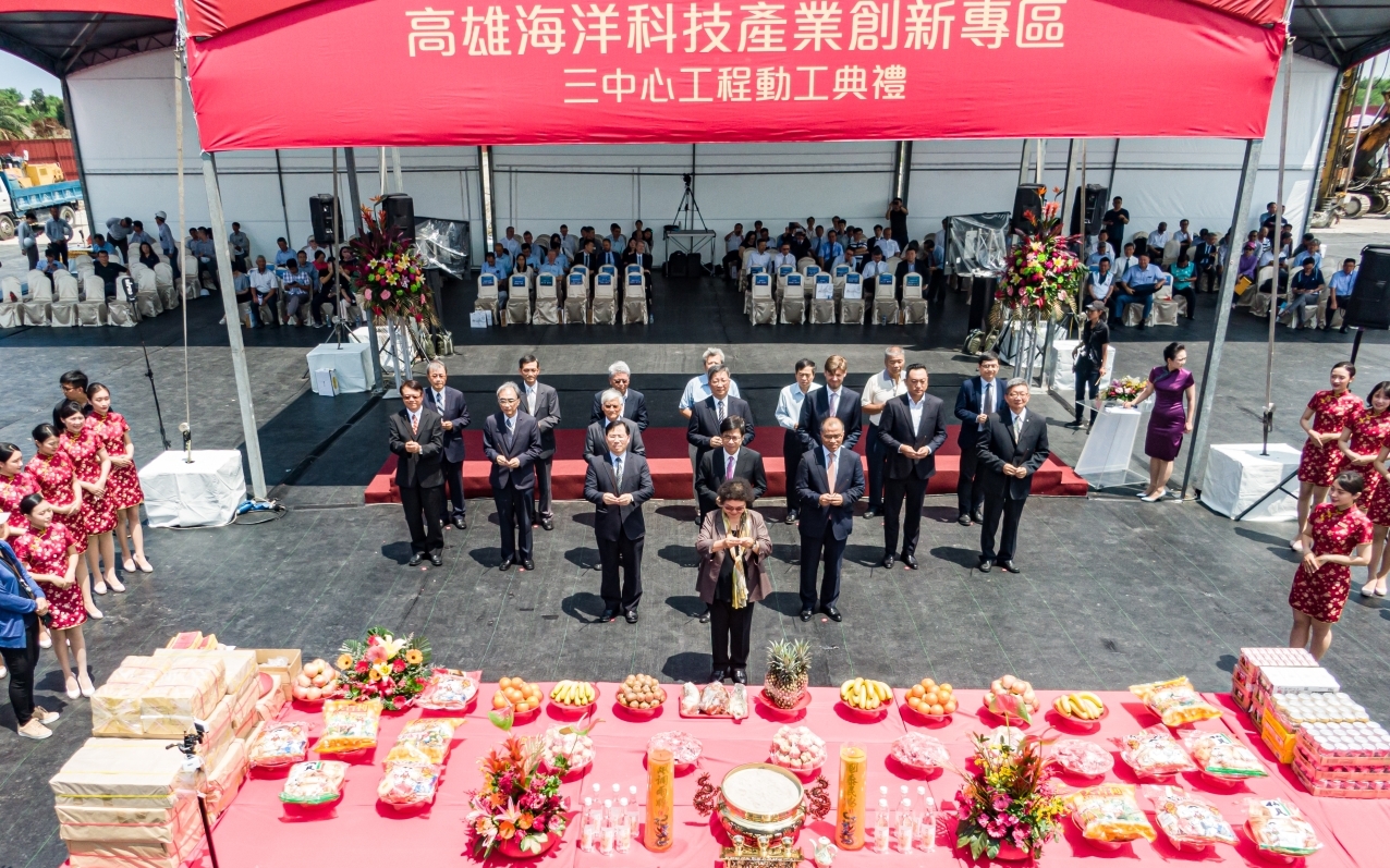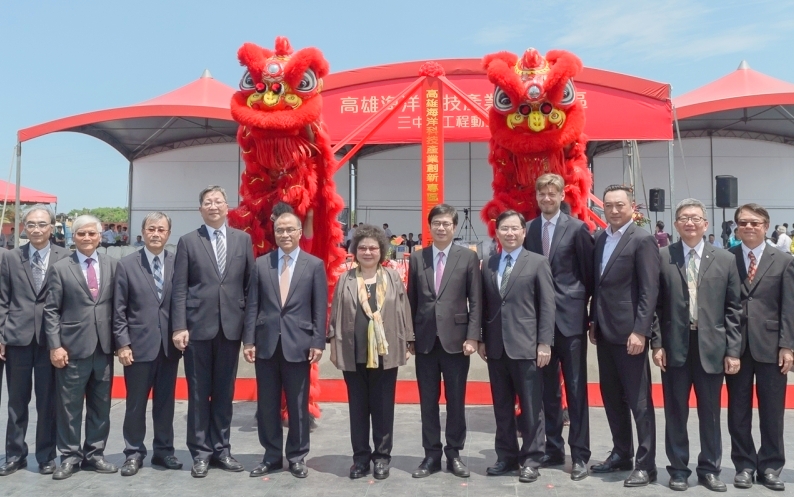 今日高雄海洋科技產業創新專區-三中心工程動工典禮由總統府陳菊秘書長、行政院陳其邁副院長、行政院南部服務中心陳政聞執行長、經濟部林全能次長、高雄市政府葉匡時副市長、經濟部能源局游振偉局長、台船公司鄭文隆董事長、中鋼公司翁朝棟董事長、CEO of Maersk Training Johan Uggla及金屬中心林仁益董事長等相關單位人員參加,共同見證海洋科技產業自主研發能量的建立邁入新里程碑。