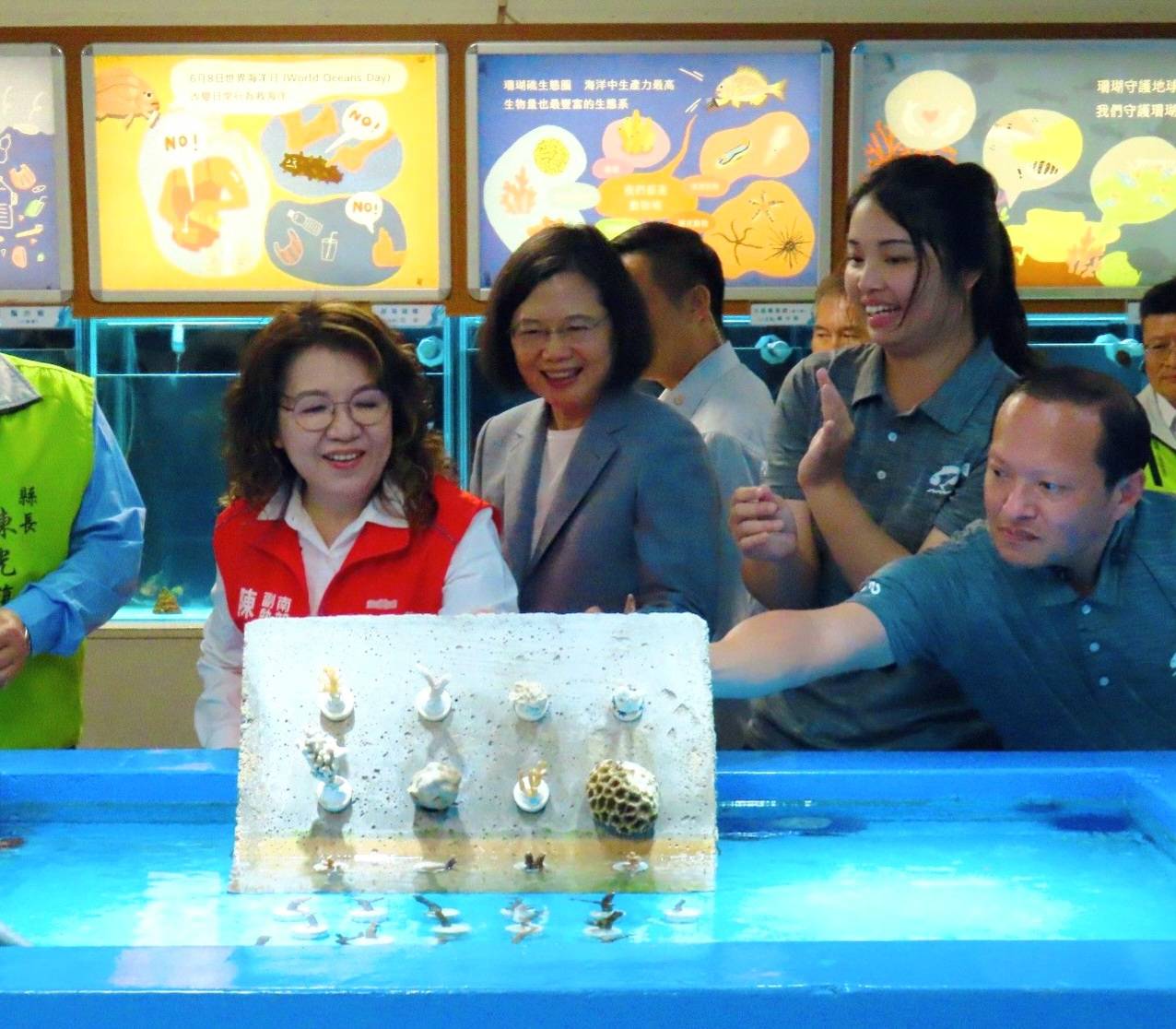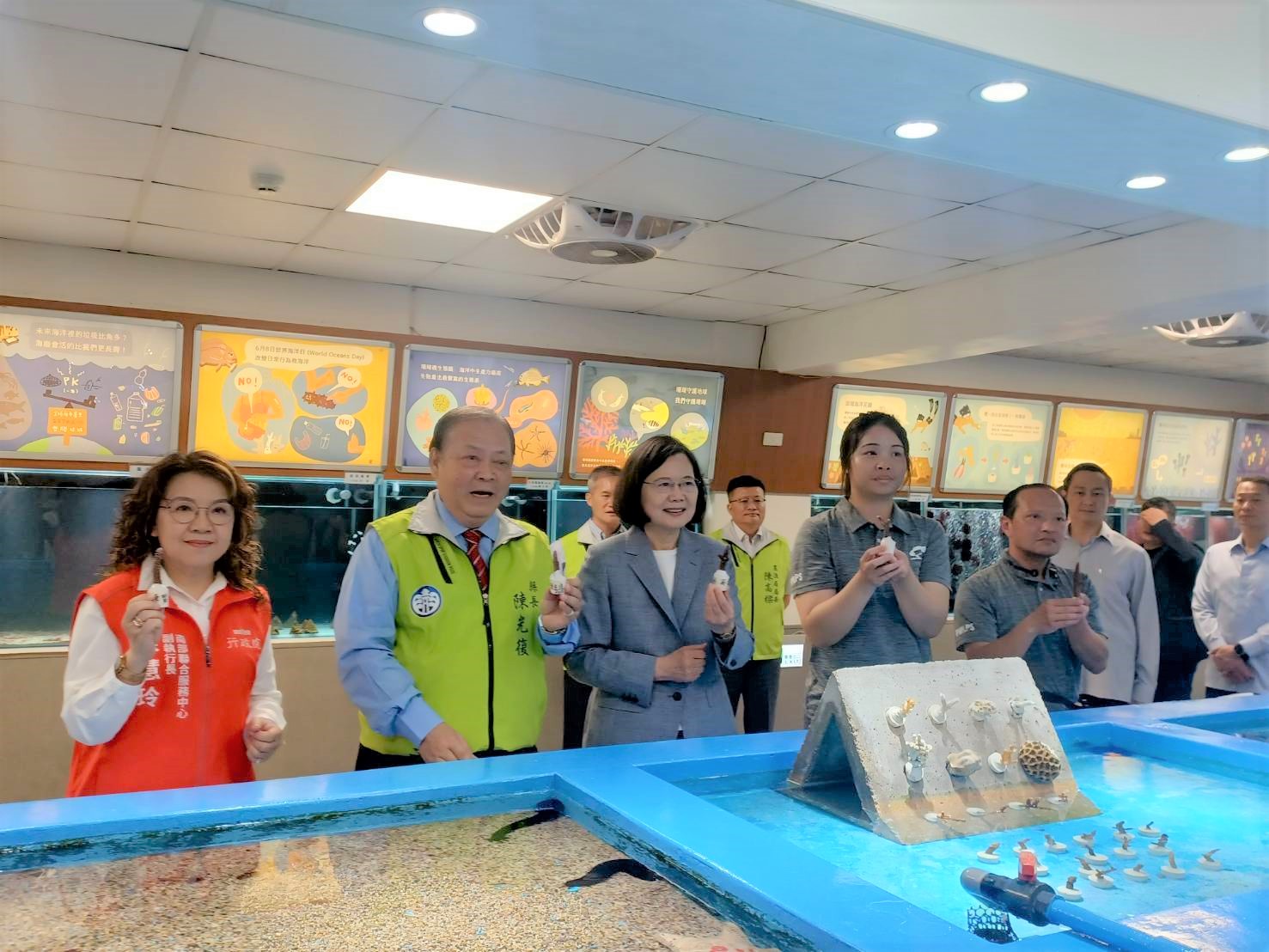 蔡英文總統今(28)日上午在澎湖縣長陳光復、總統府副秘書長黃重諺及行政院南部聯合服務中心副執行長陳慧玲陪同下,前往澎湖縣參訪澎湖海洋保育教育中心,並親自種下一株薰衣草珊瑚,以實際行動表達對海洋保育與環境教育的重視。