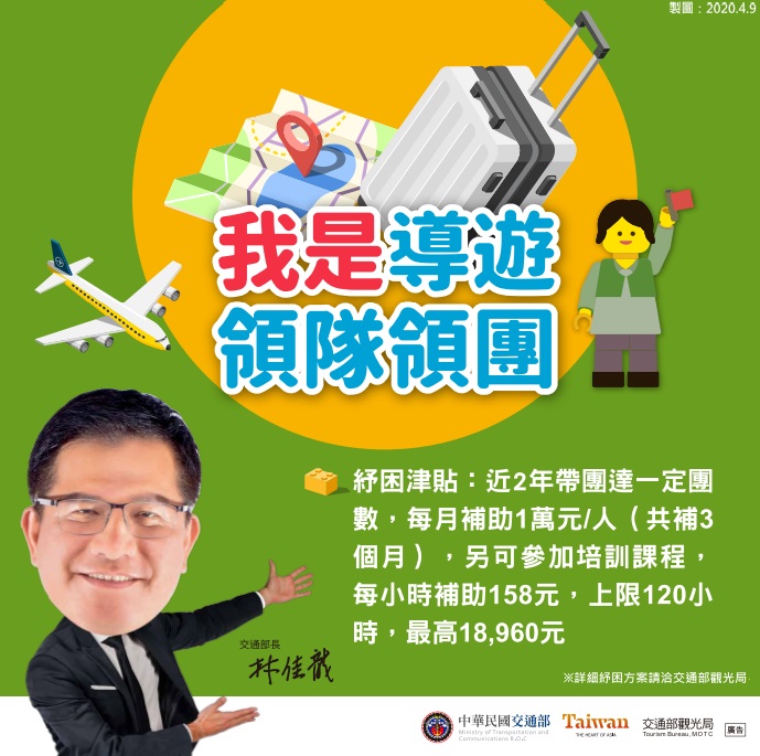 身為導遊或領隊,近2年帶團達一定團數,每人每月補助1萬元,可補3個月,另可參加培訓課程,每小時補助158元,最高18,960元。