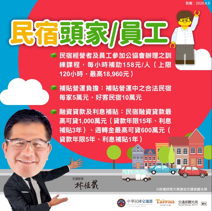 身為民宿頭家或員工,補貼營運中之合法民宿每家5萬元,好客民宿10萬元;融資貸款最高可貸1,000萬元,貸款年限15年、利息補貼3年;週轉金最高可貸600萬元,貸款年限5年、利息補貼1年;參加公協會辦理之訓練課程,每小時補助每人158元,最高18,960元。