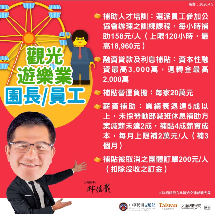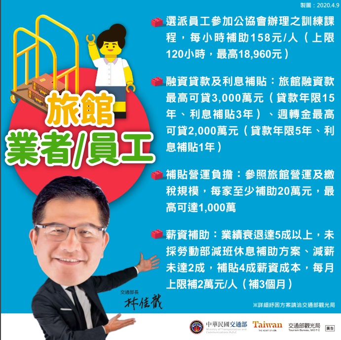 還有旅館業者及員工、觀光遊樂業園長及員工,申請內容詳可洽詢交通部觀光局:02-2349-1500,或交通部觀光局懶人包https://event.motc.gov.tw/home.jsp?id=2129&parentpath=0&websiteid=202002100001