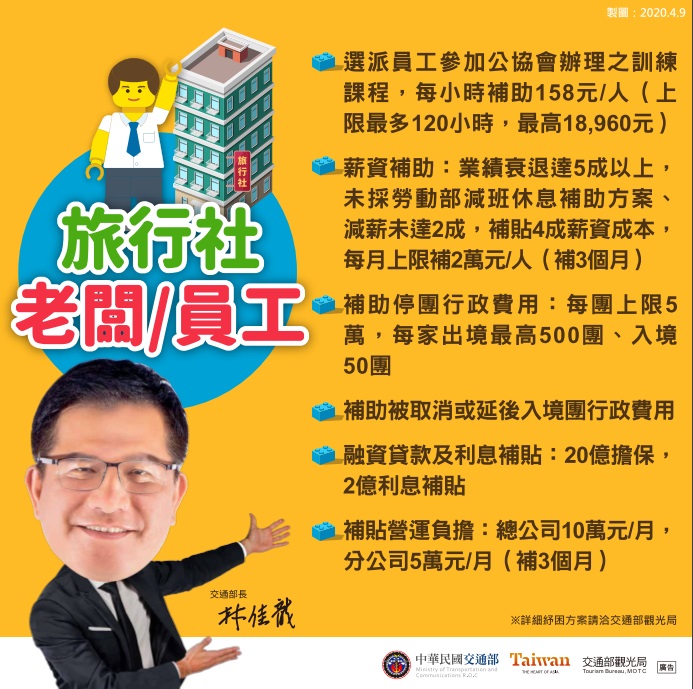 以行業別分類,身為旅行社老闆或員工,業績衰退達5成以上,未採勞動部減班休息補助方案、減薪未達2成,可補貼4成薪資成本,每人每月上限補2萬元可補3個月;停團行政費用,補助每團上限5萬,每家出境最高500團、入境50團;補貼營運負擔,總公司每月10萬元,分公司每月5萬元,可補3個月;選派員工參加公協會辦理之訓練課程,每小時補助每人158元,最高18,960元。