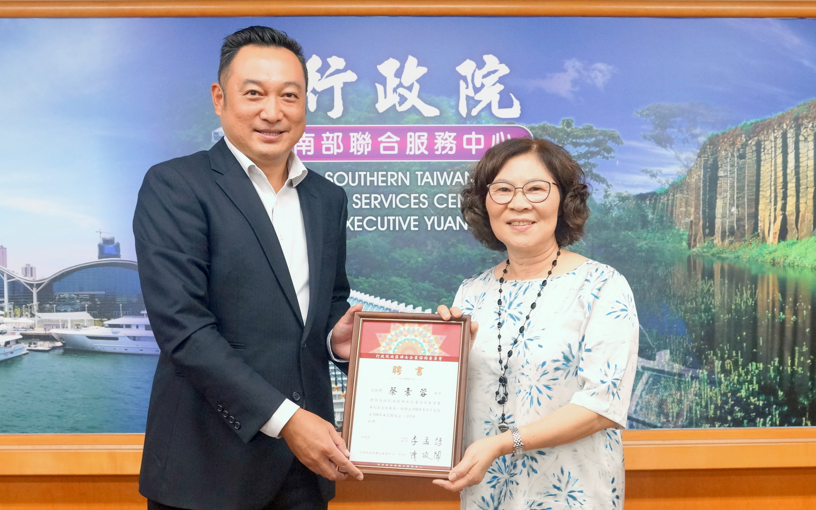 【高雄報導】行政院南部聯合服務中心於5月31日下午擴大成立第7屆行政院南區企業婦女諮詢委員會,並召開第一次會議暨頒發委員聘書;本屆委員計90位高雄、屏東、澎湖的企業婦女獲聘,由「聖遠企業公司」總經理蔡素蓉擔任主任委員,「總興實業公司」董事長謝瑪麗、「新竣億工業公司」總經理莊璧瑄與「信興名產行」負責人吳美瑤擔任副主任委員。