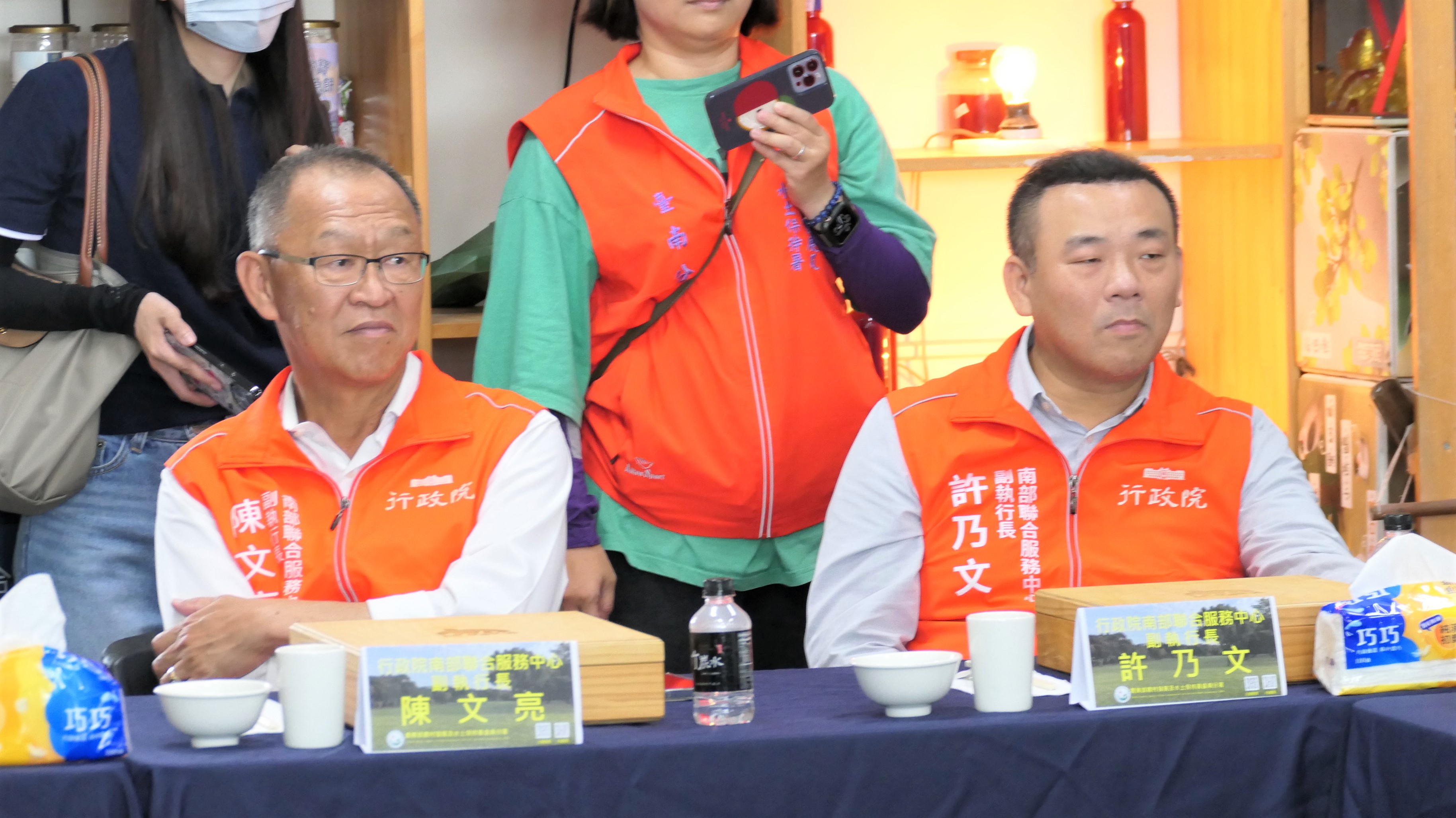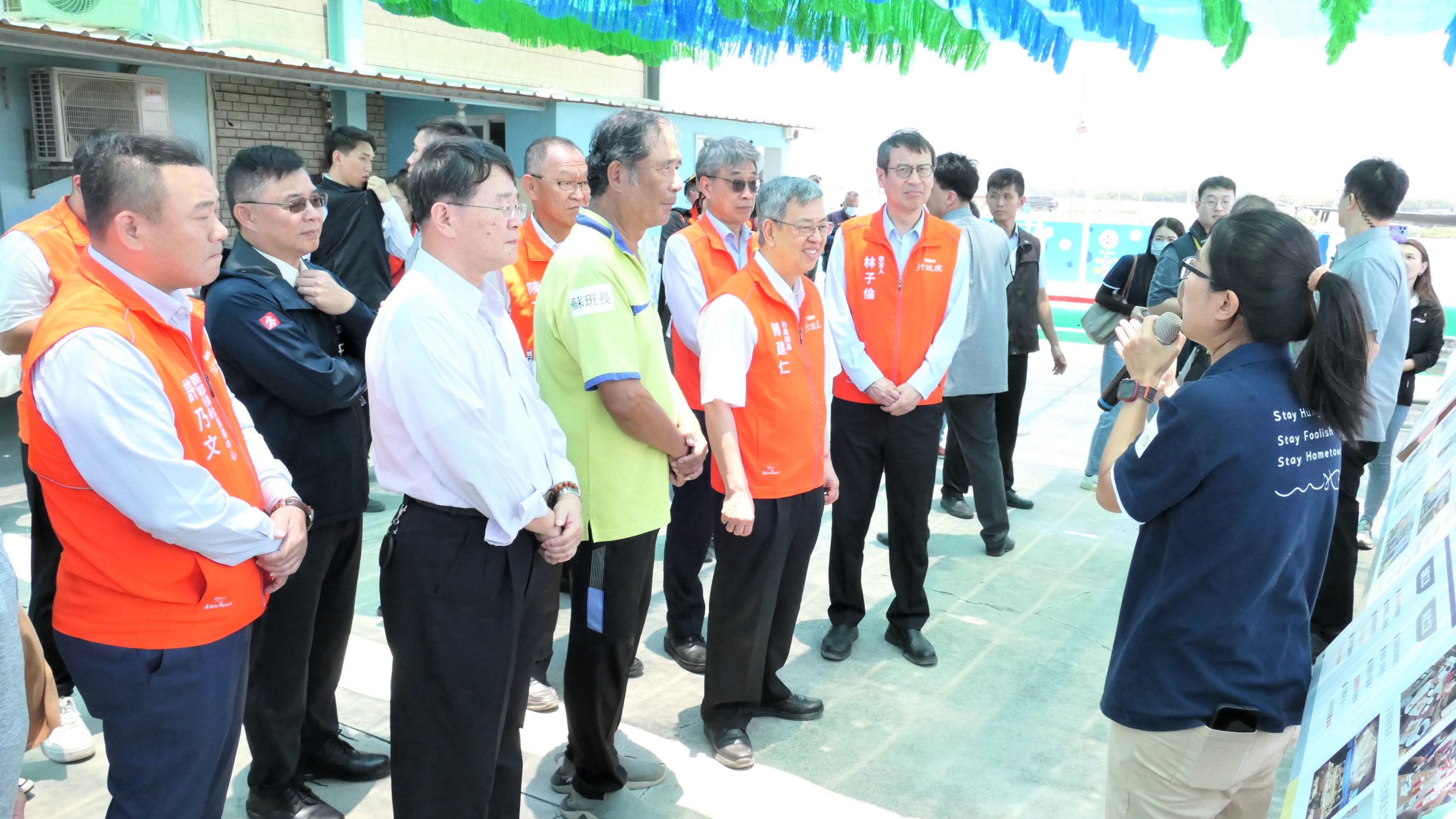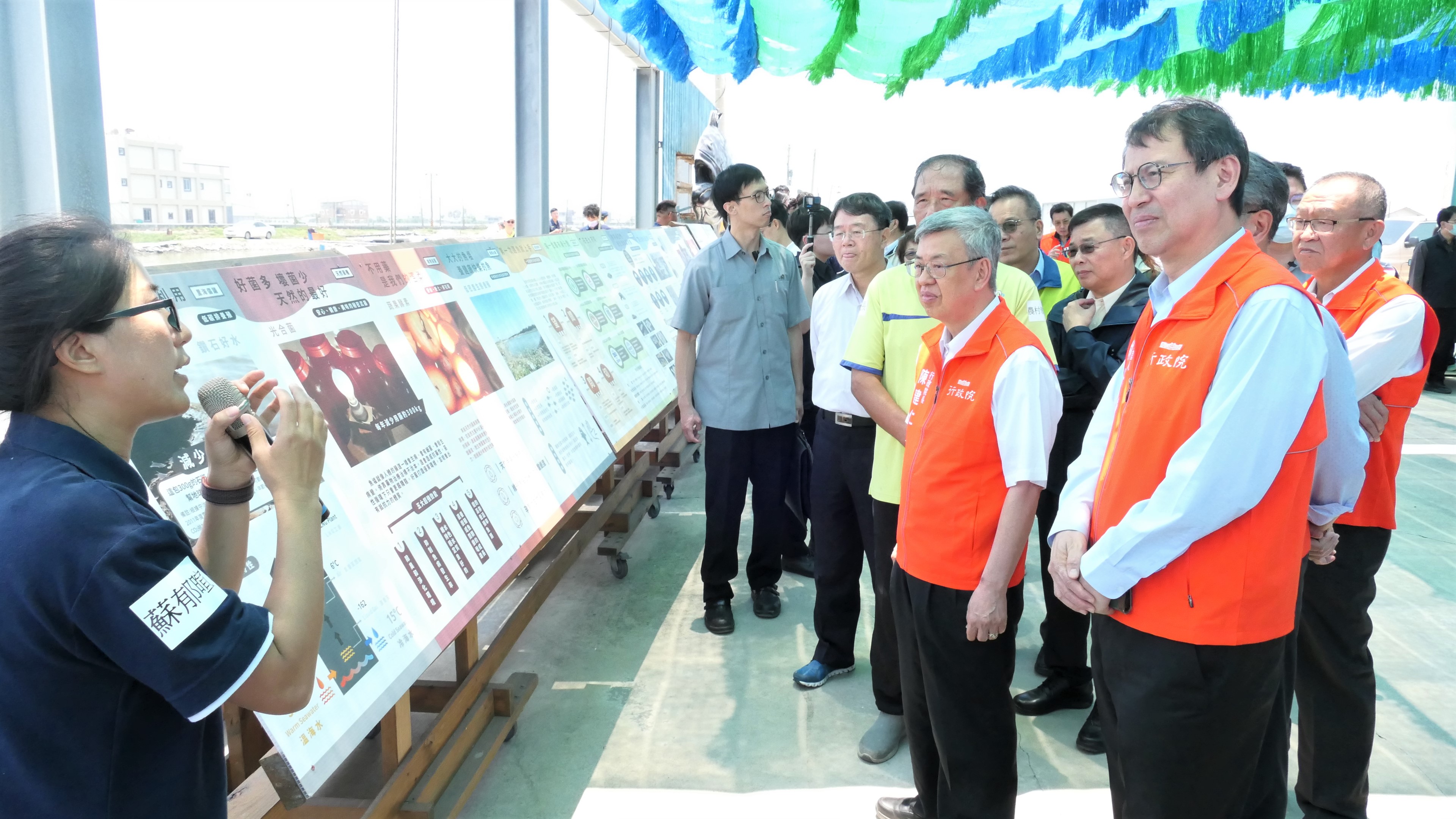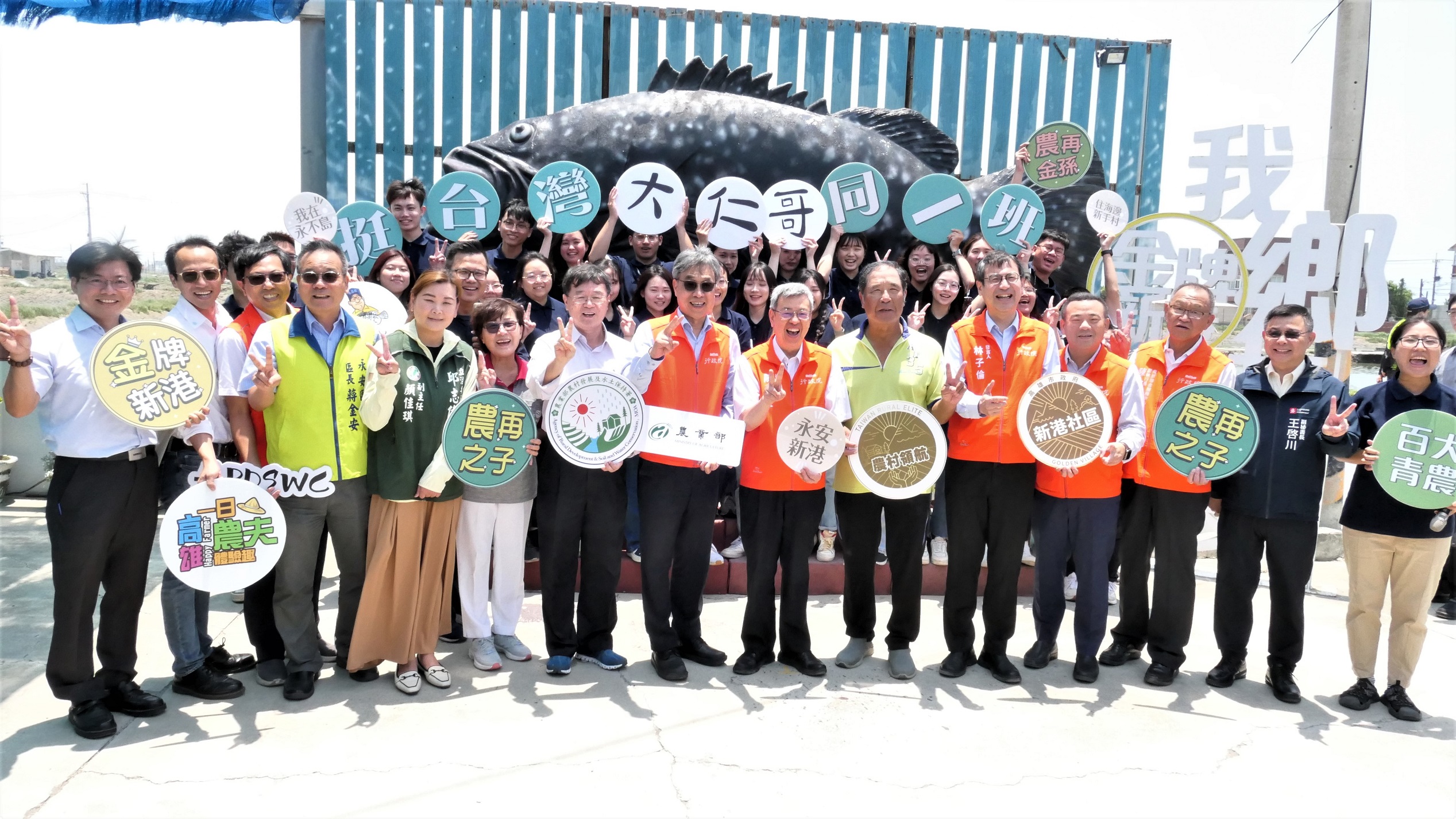 陳院長到場後與行政院林子倫發言人、行政院南部聯合服務中心許乃文副執行長、陳文亮副執行長、農業部陳駿季代理部長、農村發展及水土保持署李鎮洋署長、高雄市政府王啟川副秘書長、高雄市永安區新港社區發展協會蘇國禎榮譽理事長及所有青年軍成員合影留念。