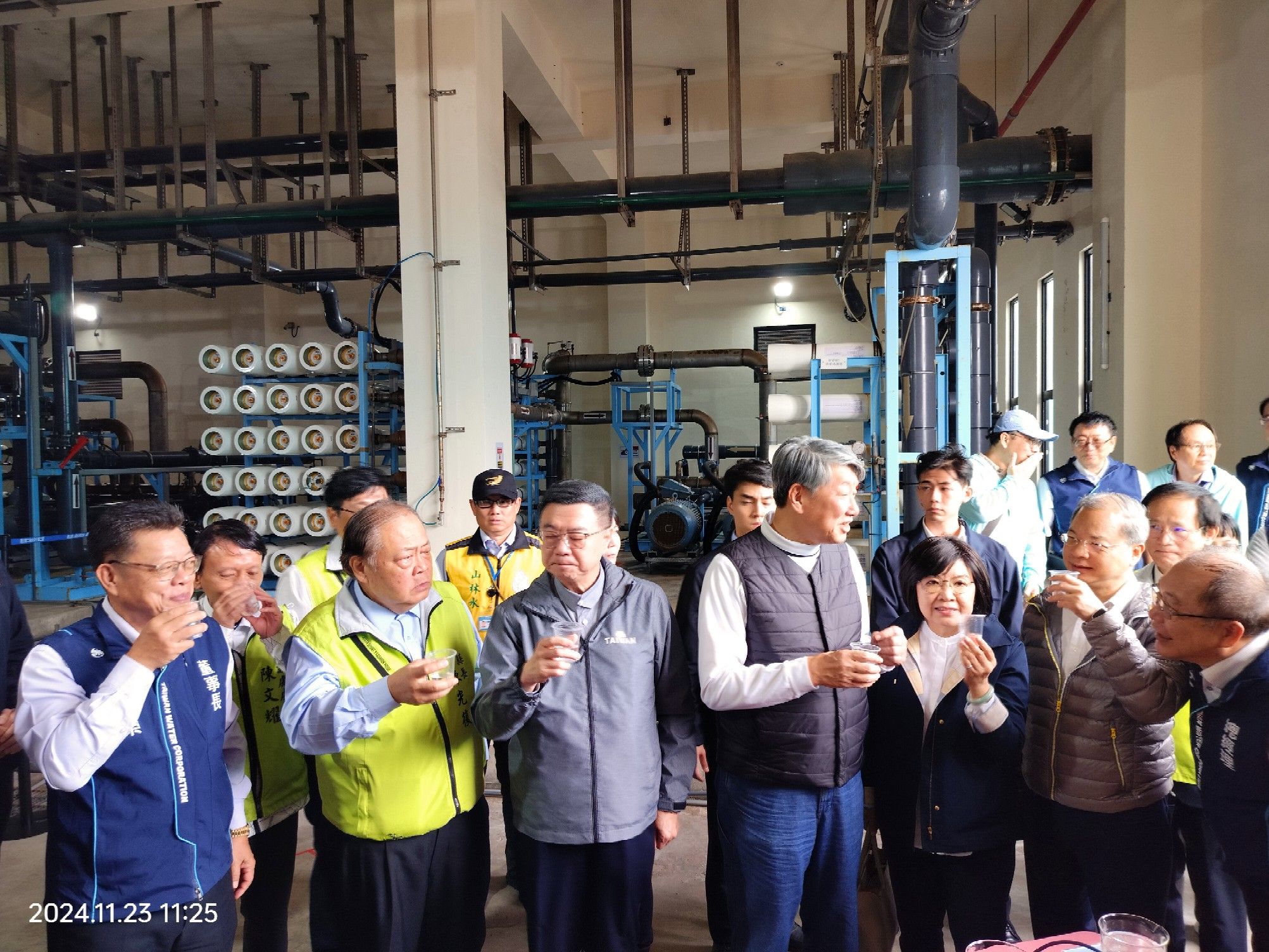 此行,卓院長到場後首先聽取台水公司李嘉榮董事長說明「澎湖地區供水情形及馬公海淡廠」簡報,了解澎湖地區自來水供水情形、離島供水改善二期計畫,以及強化供水韌性及管理。致詞結束後,卓院長偕同行政院龔明鑫秘書長、李慧芝發言人、經濟部郭智輝部長、行政院南部聯合服務中心陳慧玲副執行長、澎湖縣陳光復縣長、台水公司李嘉榮董事長、李丁來總經理一行,視察馬公6,000噸海水淡化廠,於RO機房了解海水淡化步驟與環節,並試飲海淡水。