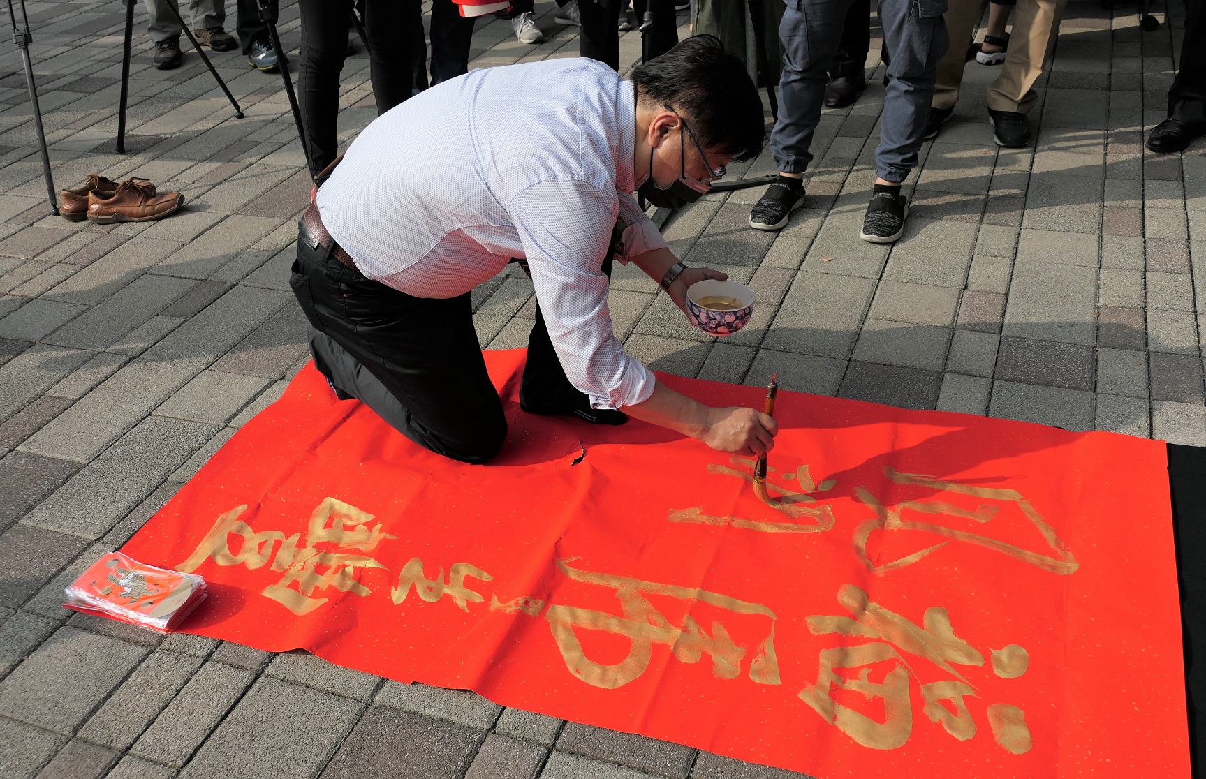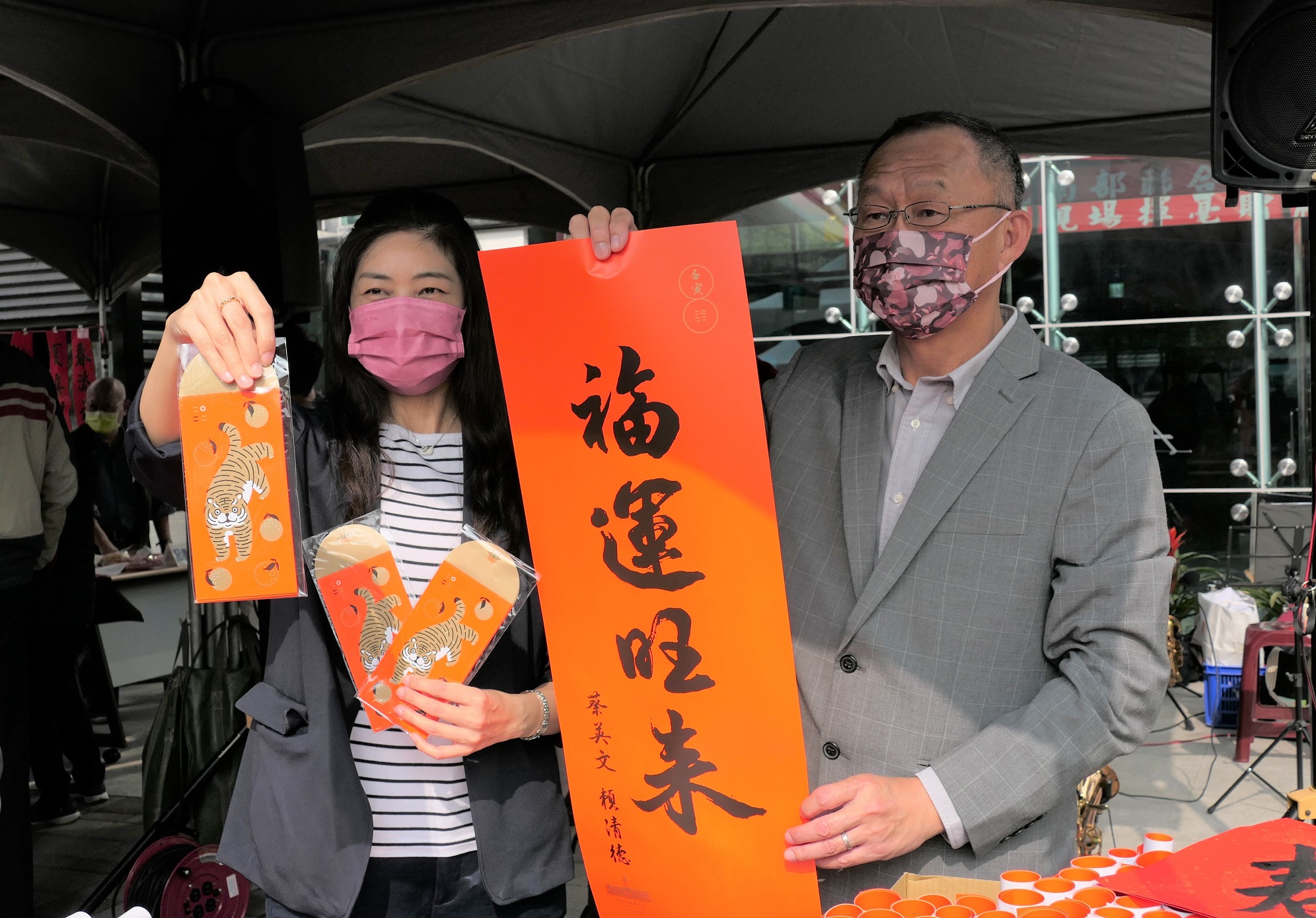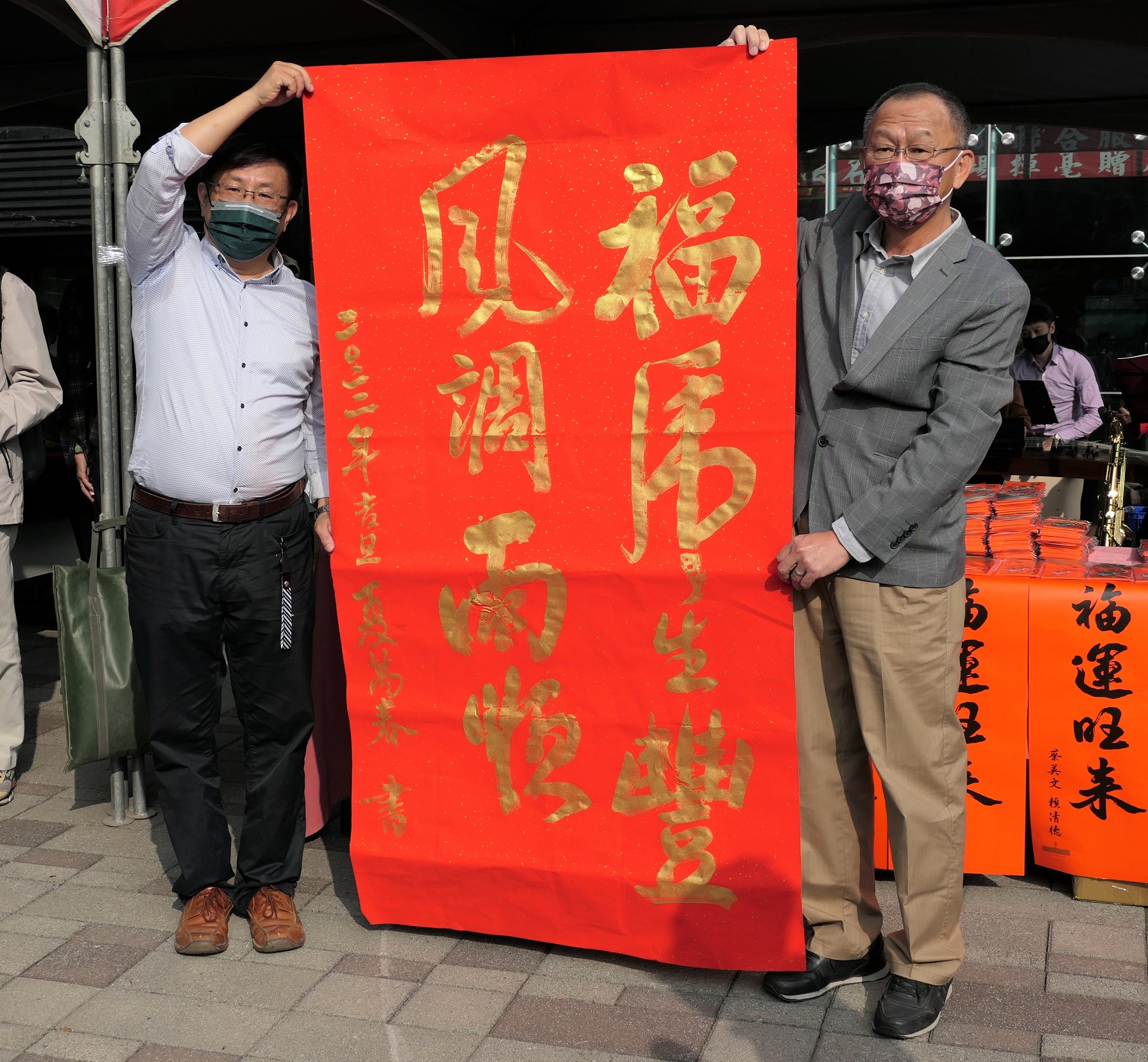 活動一連兩天邀請到蔡典成、蔡武勳、藍進士、楊壽雲等書法名家現場揮毫寫贈春聯,此次還邀請中心書法家夏萬春,以金色墨筆書寫「福虎生豐 風調雨順」大字,中心也首次邀請行政院秘書處曾錦春參議來到現場書寫,配合現場樂團演奏許多耳熟能詳歌曲,展現年節濃厚氣氛。