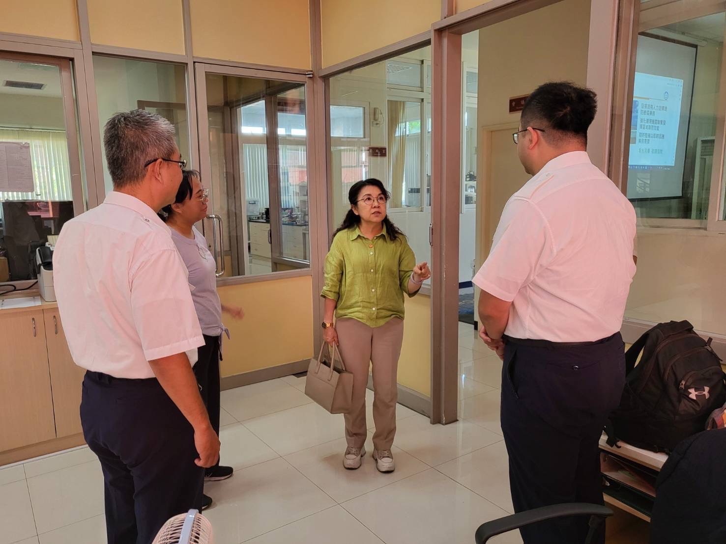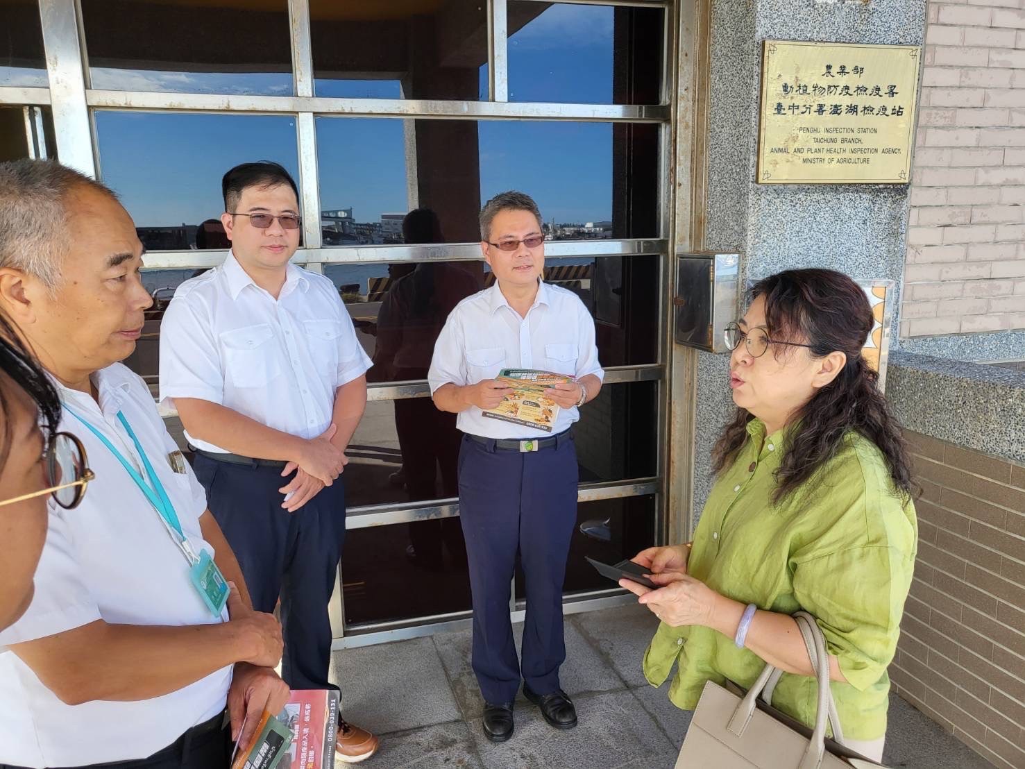 隨後,陳慧玲副執行長拜訪了動植物防疫檢疫局臺中分局澎湖檢疫站,與李樹全站長討論該檢疫站的相關業務。主要業務包括偶蹄類動物進出澎湖地區的檢查、督導澎湖縣肉品市場屠宰衛生檢查及協助處理走私沒入的動植物產品等。然而,該單位目前面臨的人力問題,由於防檢疫業務涉及輪班制度,現有編制人員稍嫌不足。陳慧玲副執行長表示,南服中心將盡力尋求解決這一問題的方法。
