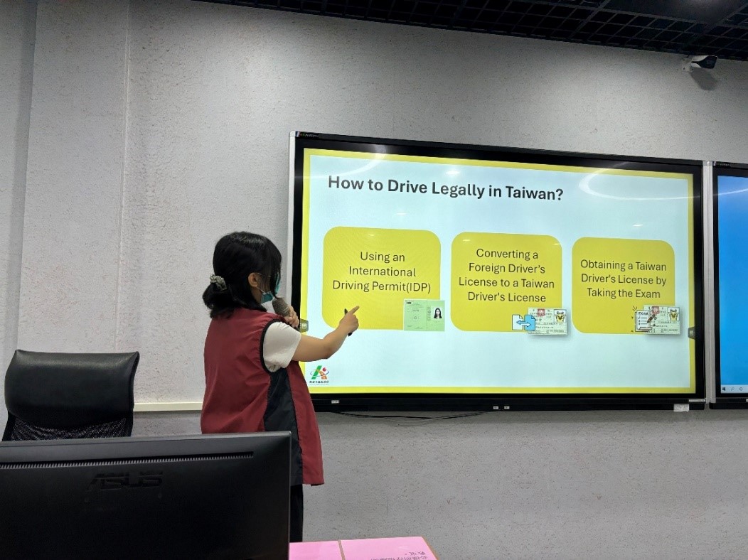 另外,對許多外籍人士或學生來說,臺灣截然不同的交通文化和制度,以及對臺灣交通法規及考照規定不甚瞭解,影響降低考照意願,因而容易造成交通意外事故或無照騎車的情事,交通部公路局高雄市區監理所胡又文科員以幽默的短片和簡易圖片等教材進行講解,會後與師生互動式實際教學,達到更深入瞭解。