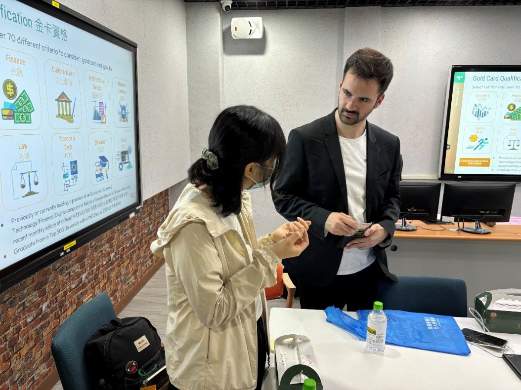 本次政策說明會首先由國際人才服務及延攬中心南部辦公室Brad(美國籍)專員介紹就業金卡、工作許可及簽證等臺灣歡迎優秀應屆畢業生留台從事工作等議題分享。