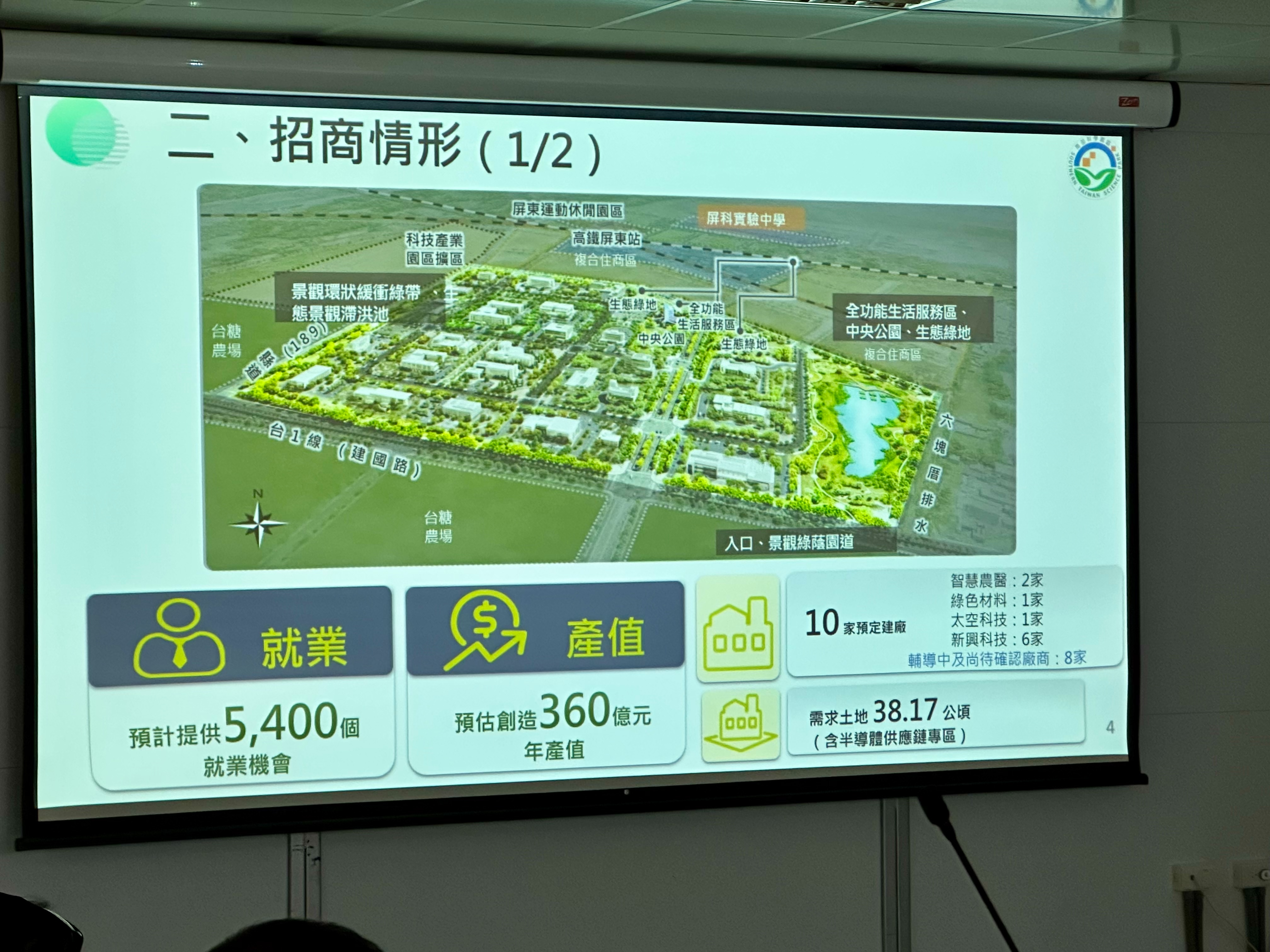 園管局表示,屏東科技產業園區(擴區)鎖定精密電子、塑膠製品、金屬加工及機械設備等策略性產業,並具備「下高鐵就進廠」的交通優勢,預估可帶動約新台幣50億元投資,創造年產值100億元,並提供790個就業機會。
