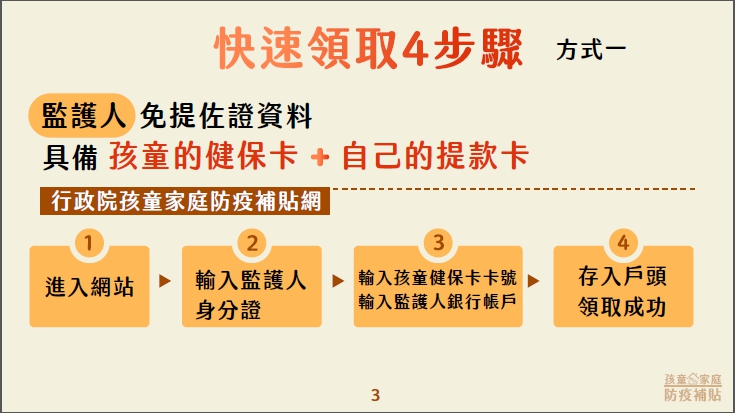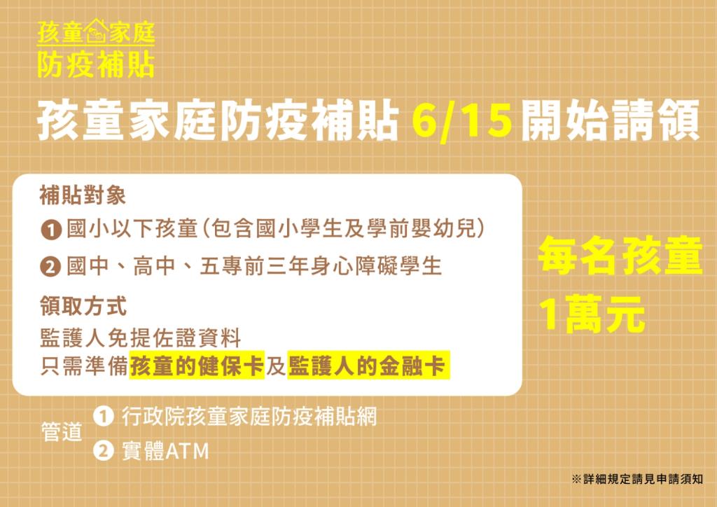 其中「孩童家庭防疫補貼」是對國小以下孩童及國中、高中、五專前三年身心障礙學生,補貼每名孩童1萬元,持孩童的健保卡及監護人的金融卡,可透過專屬網站或ATM領取現金1萬元。