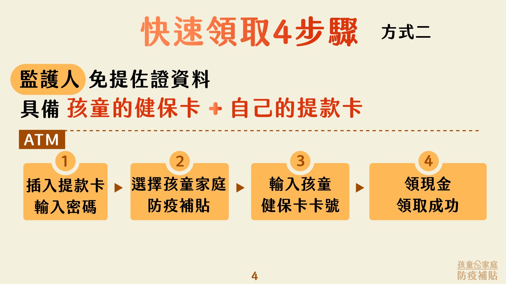 領取方式有兩種,可進入「行政院孩童家庭防疫補貼網」,輸入監護人身分字號、輸入孩童健保卡卡號、輸入監護人銀行帳戶,1萬元即匯入帳戶。或可於ATM插入提款卡、選擇孩童家庭防疫補貼、輸入孩童健保卡號,即可提領1萬元現金。