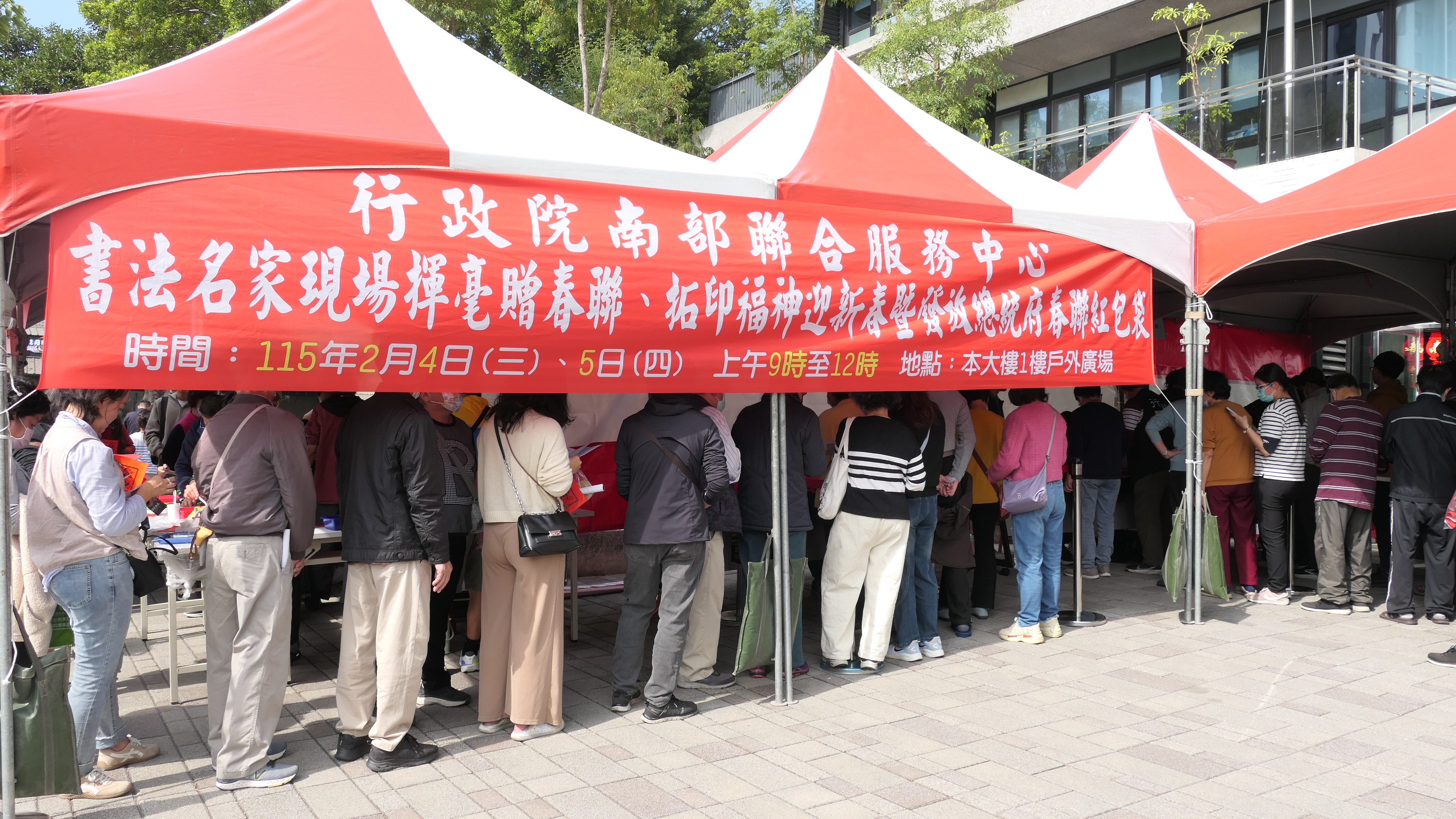行政院南部聯合服務中心於115年2月4日、5日上午9時至12時,於中心一樓門廊前盛大舉行新春系列活動。現場邀請書法名家揮毫贈墨寶、傳統拓印體驗及客語吉祥話教學,並同步贈送總統府限量春聯、紅包袋及精美開運禮,贈完為止,歡迎民眾踴躍參與。