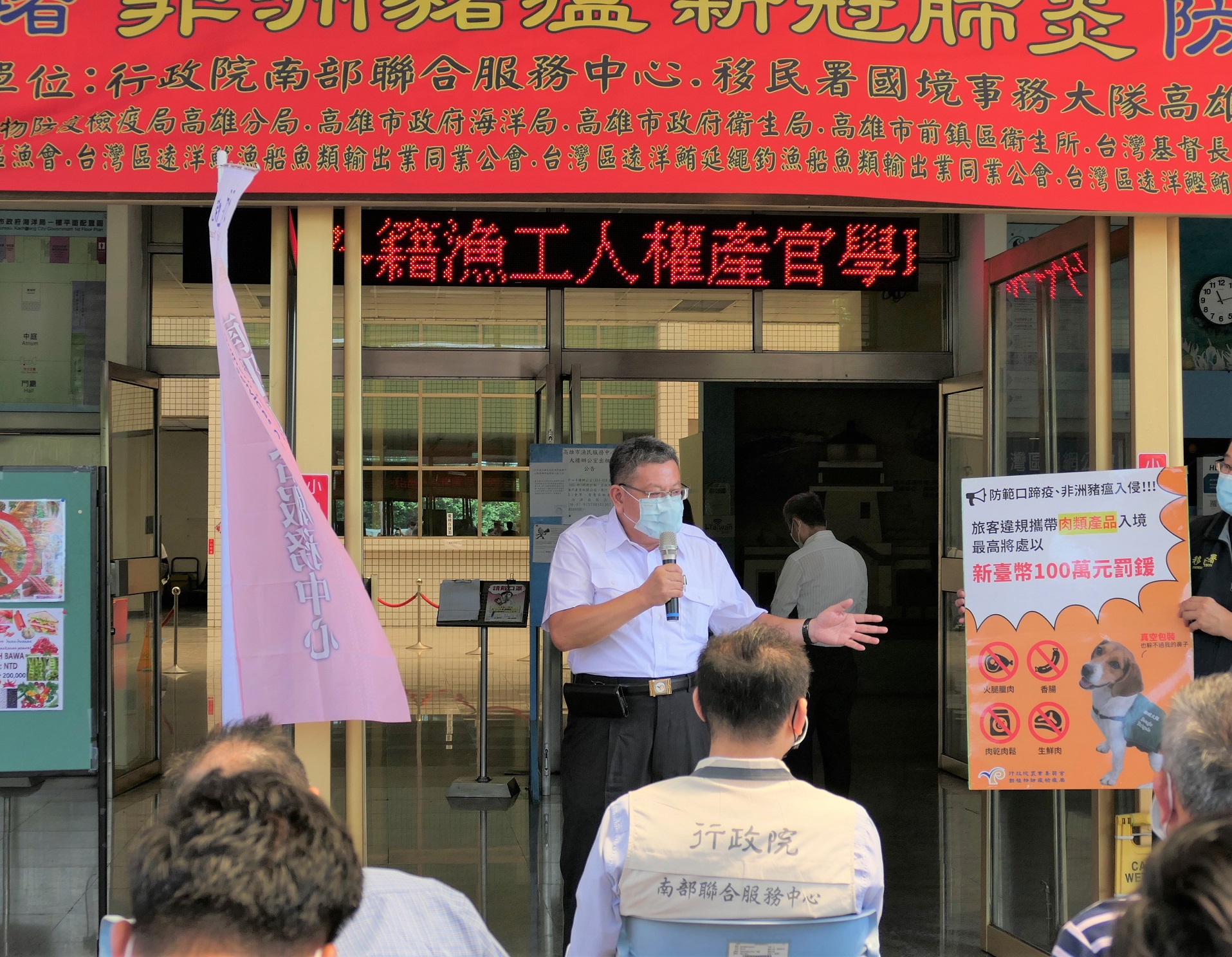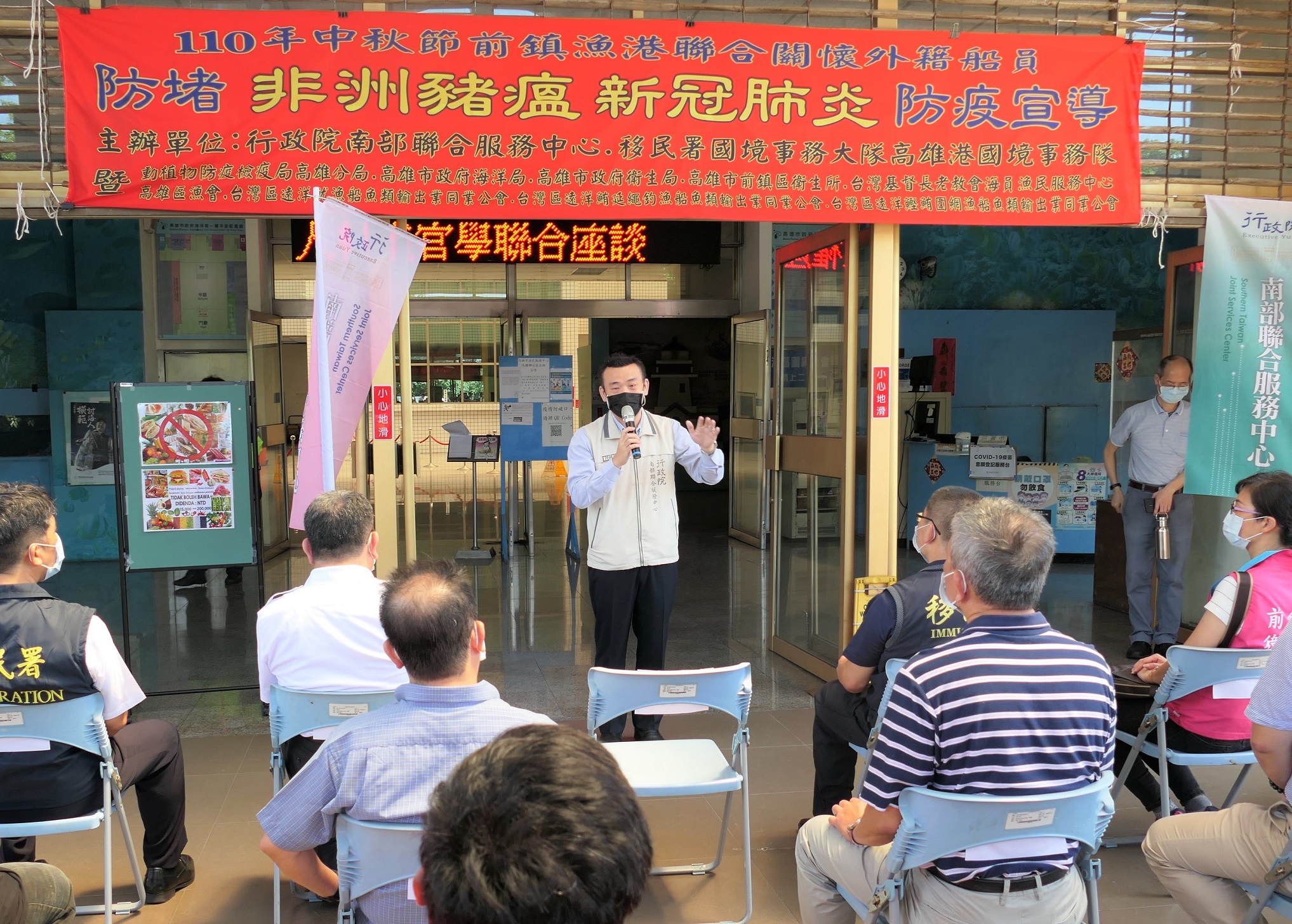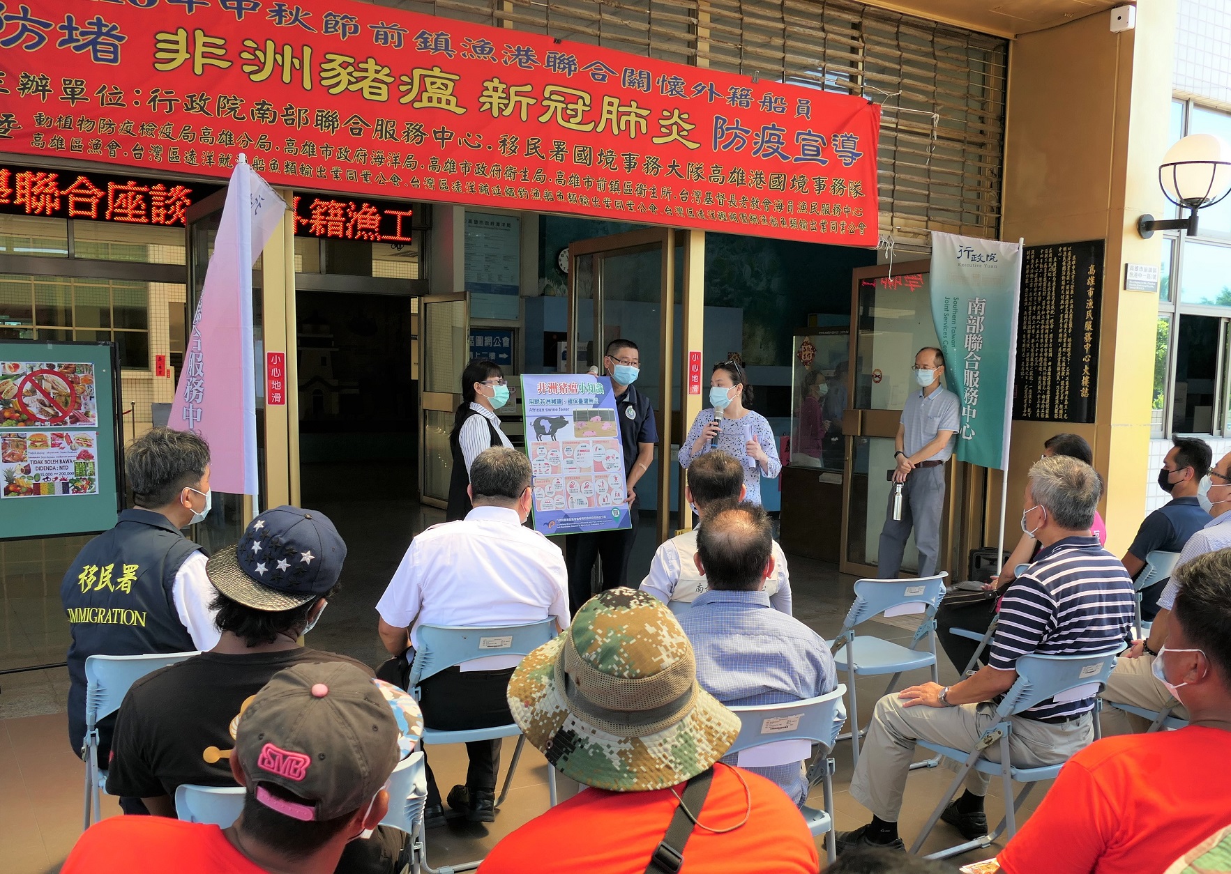 前鎮漁港為全國遠洋漁船重鎮,政府各級單位長期重視漁業發展與永續經營,在今(15)日中秋節連假前,適逢遠洋漁船返港整補之際,移民署國境事務大隊高雄港隊與行政院南部聯合服務中心結合動植物防疫檢疫局高雄分局、高雄市政府海洋局、衛生局等機關與各漁業公會、高雄區漁會在前鎮漁港漁民服務中心關懷外籍船員暨進行防堵非洲豬瘟及新冠肺炎防疫宣導。